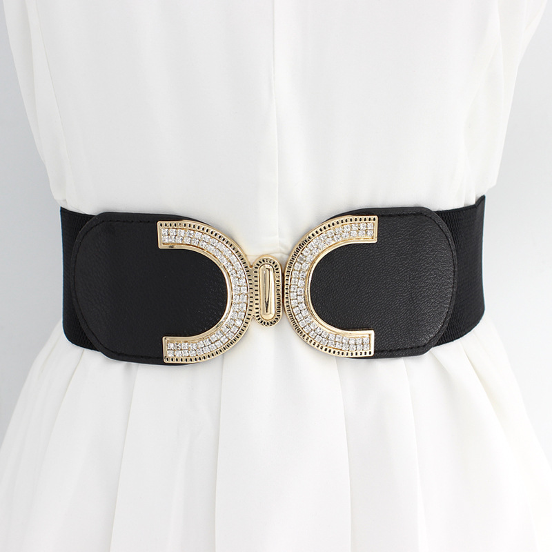 Women's rhinestone inlaid elastic waist seal sweet double C buckle dress slim waist wide belt one-piece delivery