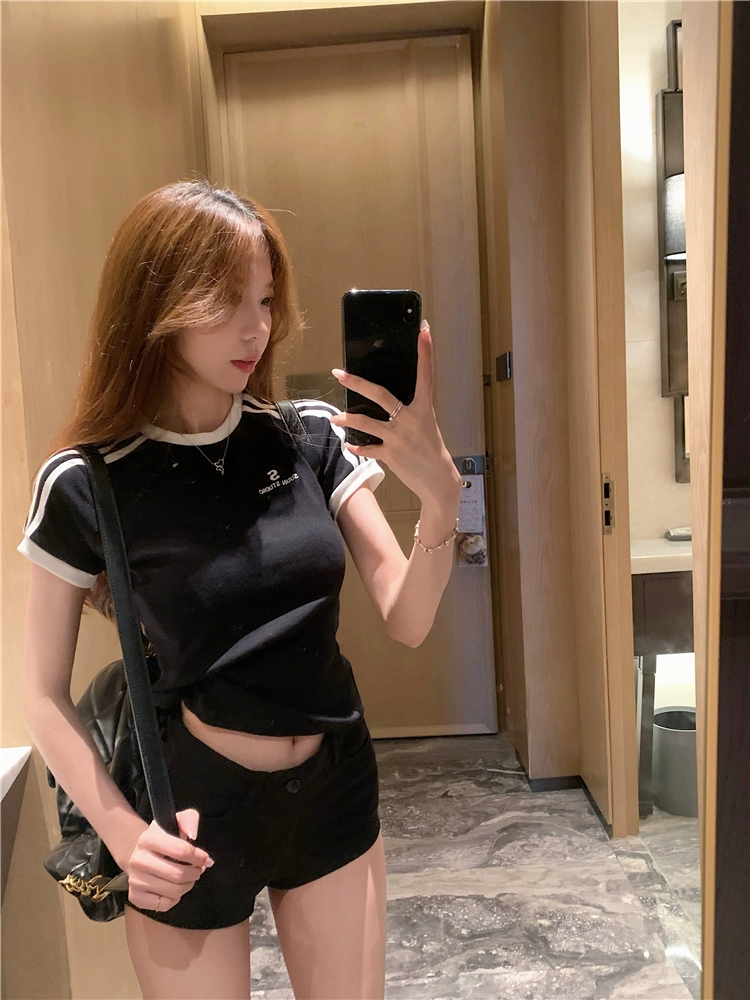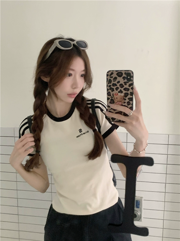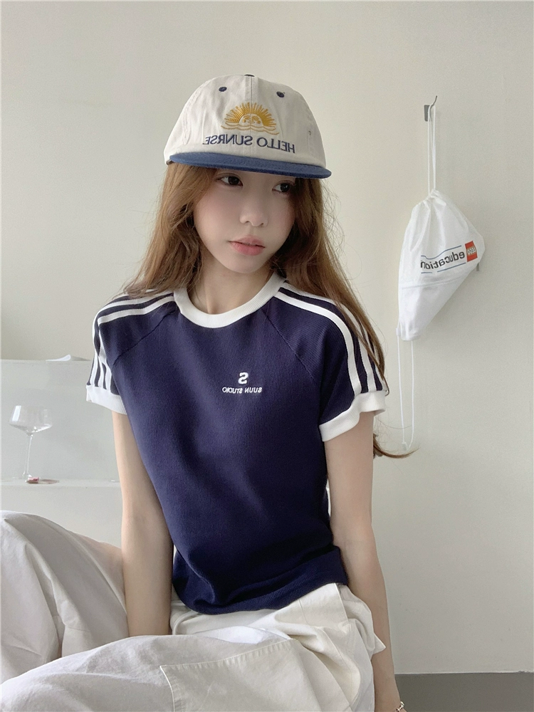 Women’s right shoulder summer patchwork slim short sleeve T-shirt