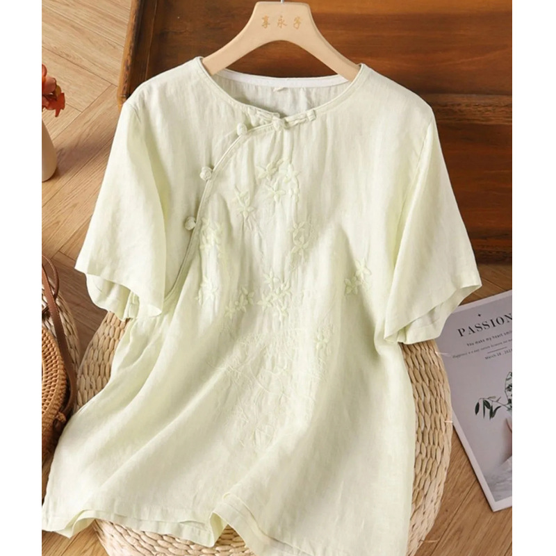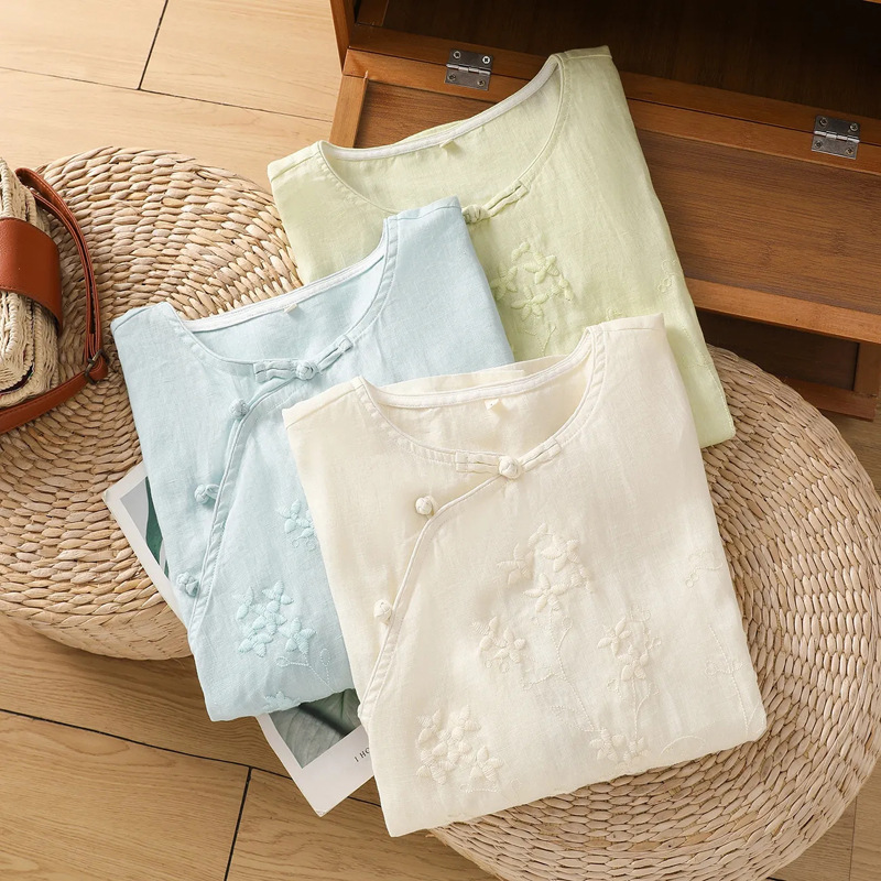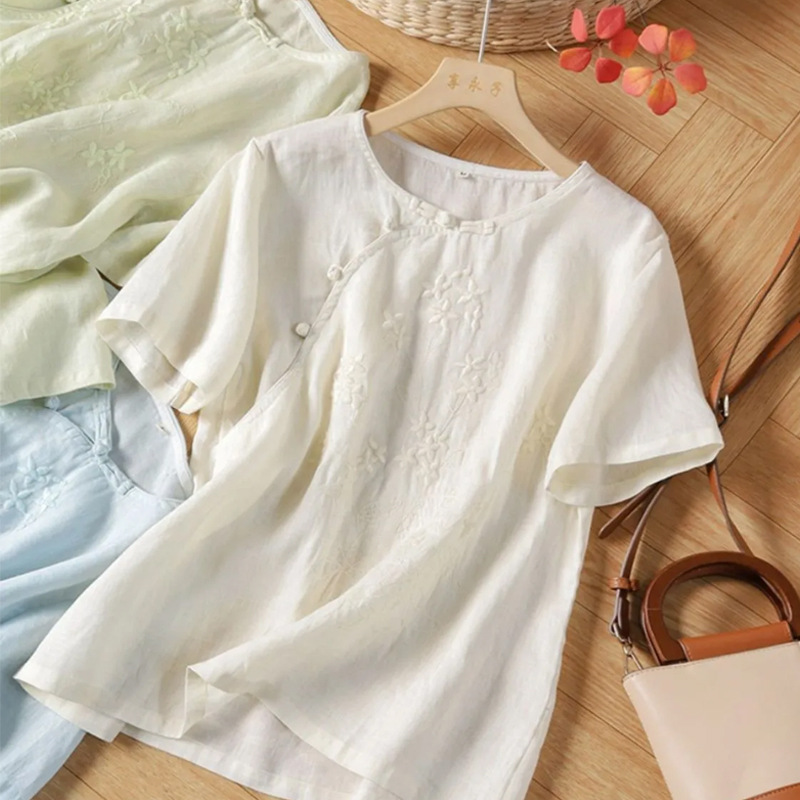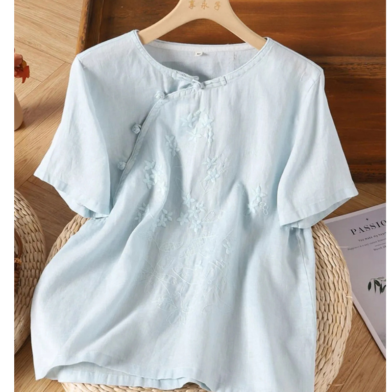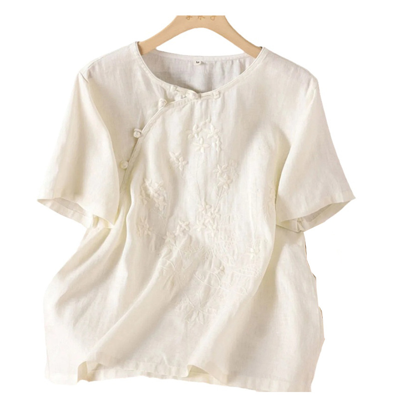 | nameOriginal | Women's Short-sleeved Embroidered Loose Artistic Retro 2024 Tea Suit Summer New Cotton and Linen Top Slant Flap Button Up Shirt |