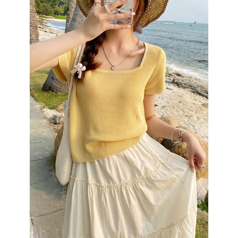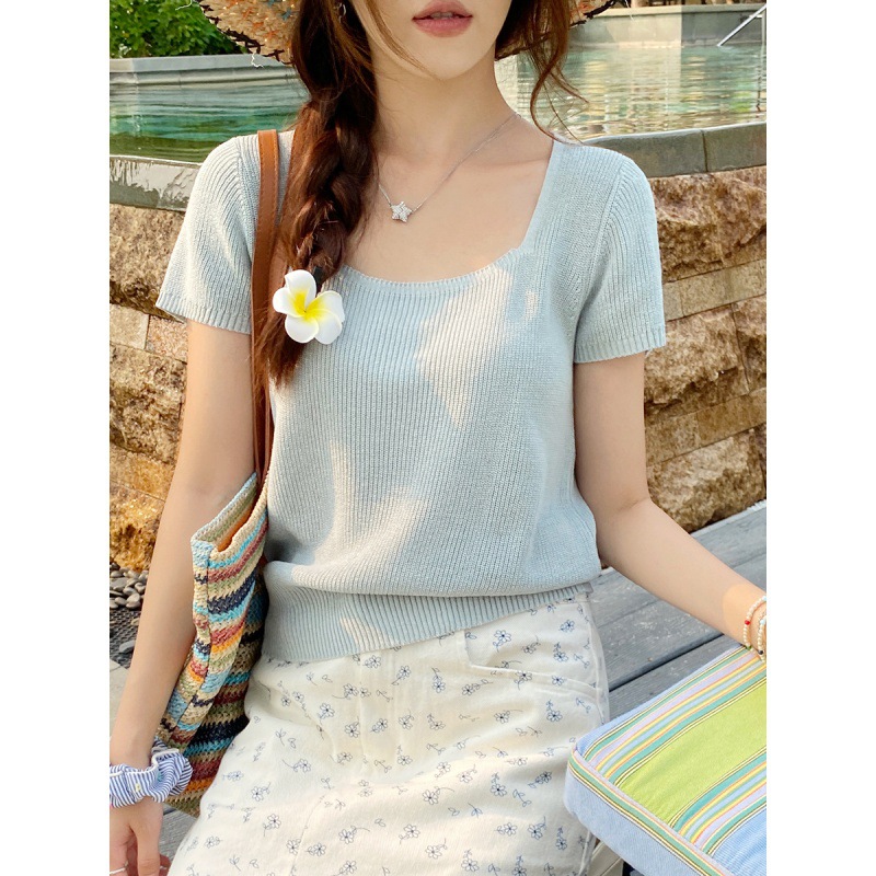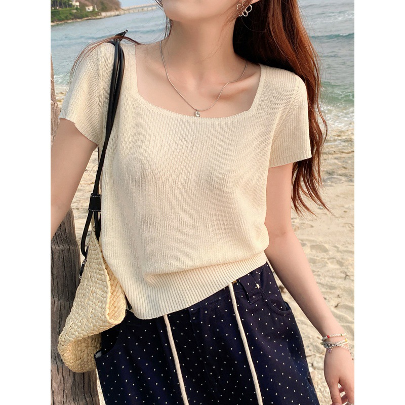 | nameOriginal | Women's Short-sleeved Sweater 2024 New Summer Thin T-shirt Ice Silk Square Collar Top Outer Short Slim-fit Blouse |