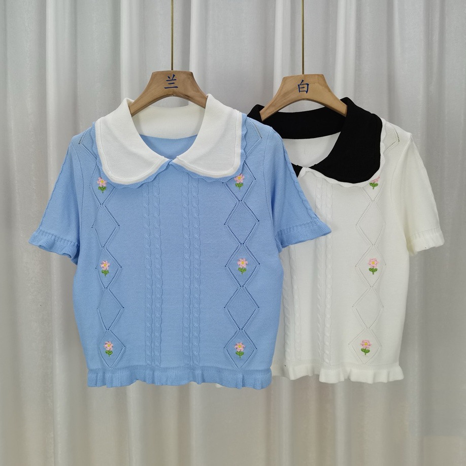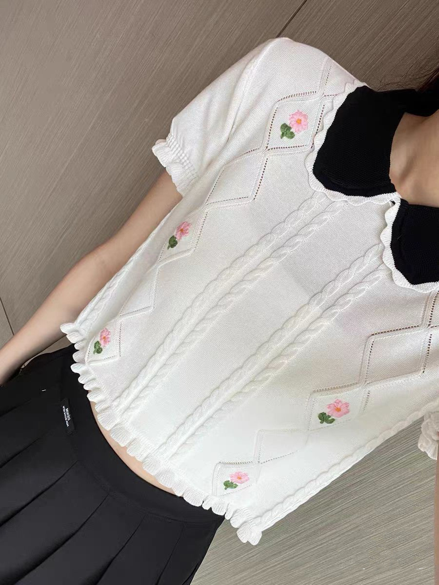 Women’s short-sleeved T-shirt summer new design sense niche versatile Japanese retro short knitted puff sleeve top fashion