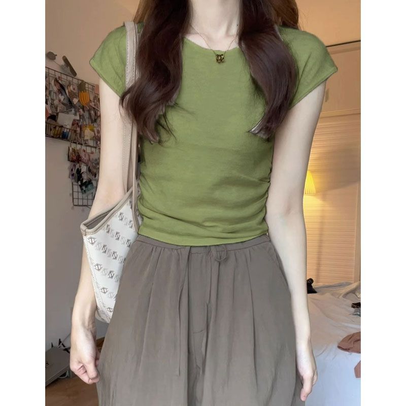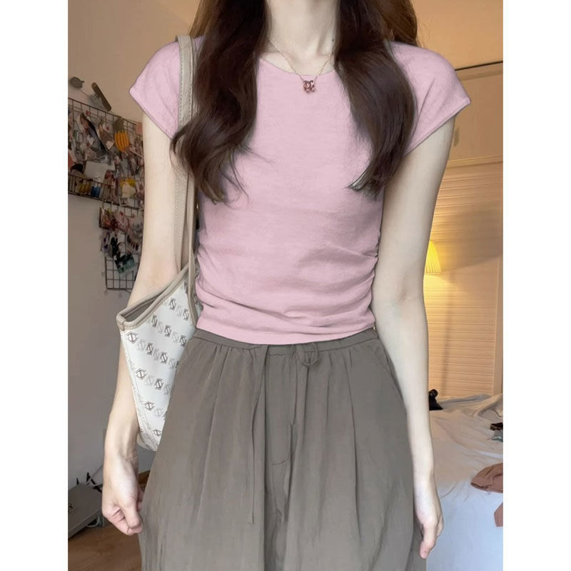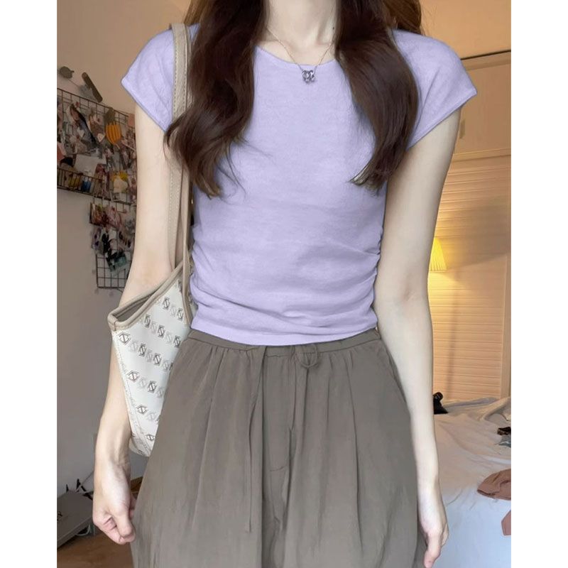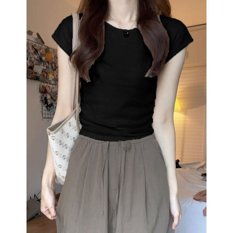 Women's Shoulder Knitted Short-sleeved Shirt for Summer New Slim-fit Slimming Tight Waist American Style Spice Girl Short Small-sleeved Top