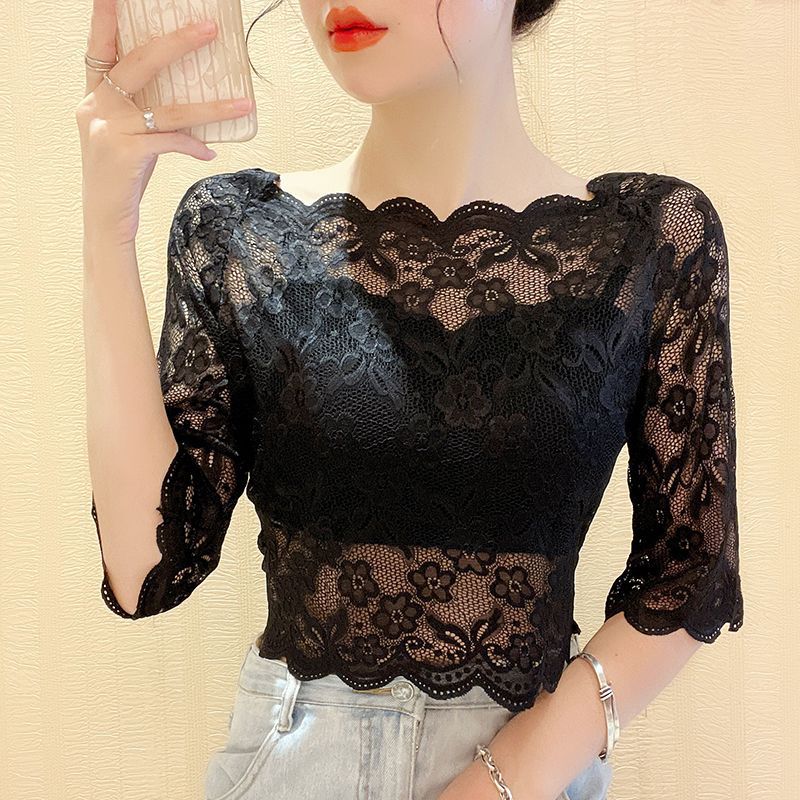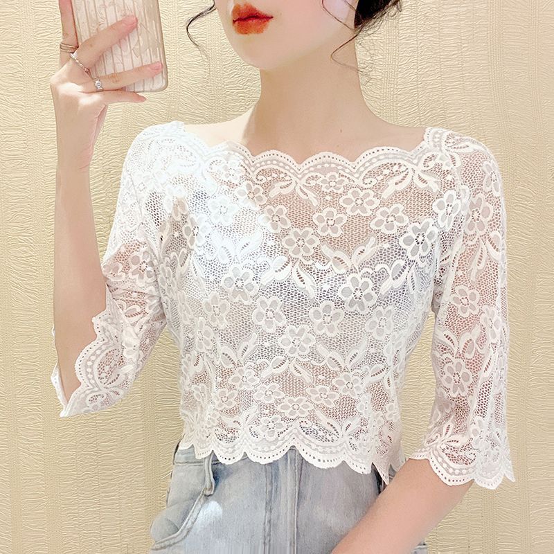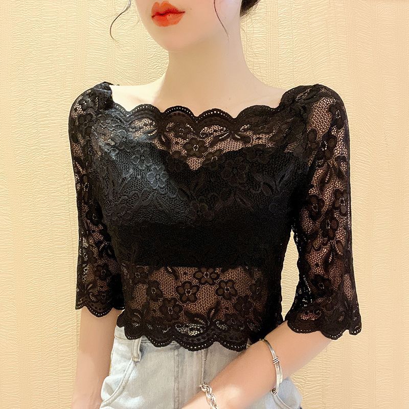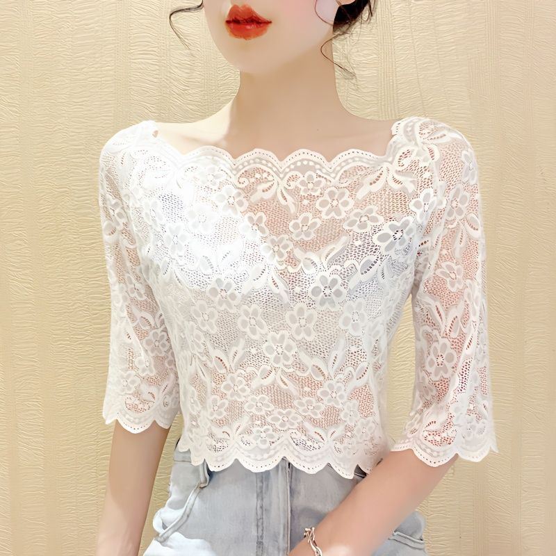 | nameOriginal | Women's Shoulder Lace Base Shirt Mesh T-shirt Mid-sleeve Hollow Lace Shirt Short Top |
