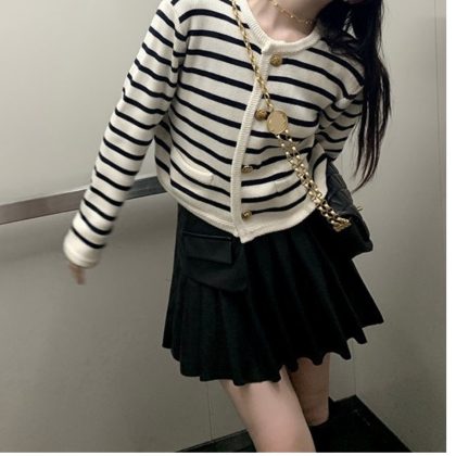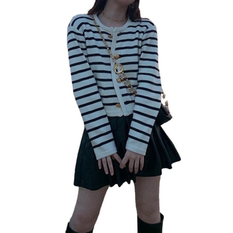 Women's Spring and Autumn French Loose Short Outer Sweater Jacket with Gold Buckle Color Stripe Crew Neck and Chanel Style Knitted Cardigan