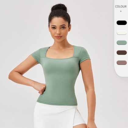 Women's Spring and Summer Square Collar Sports Short-sleeved Slim-fit Tight Quick-dry Running Fitness T-shirt Naked Breathable Yoga Top