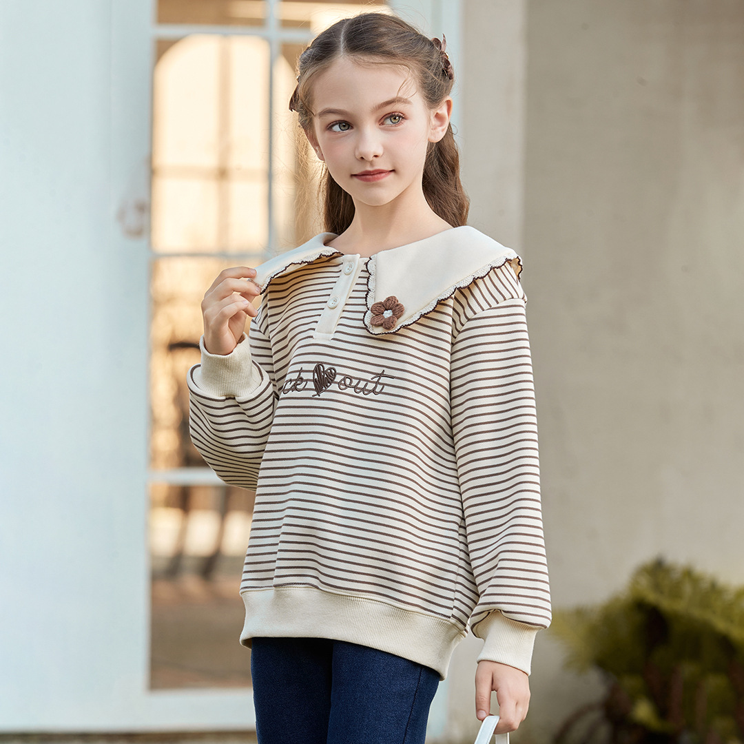 Women’s Spring long-sleeved sweater 2024 fashionable striped flower large shoulder round neck navy college style pullover top wholesale