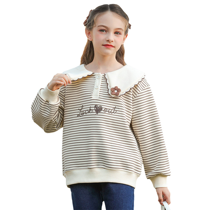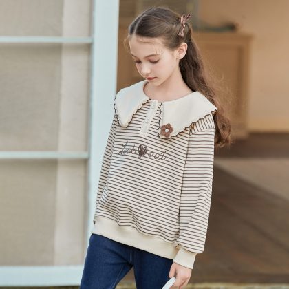 Women’s Spring long-sleeved sweater 2024 fashionable striped flower large shoulder round neck navy college style pullover top wholesale