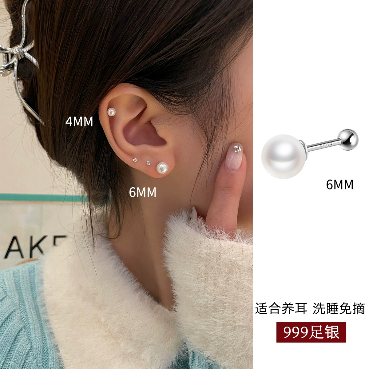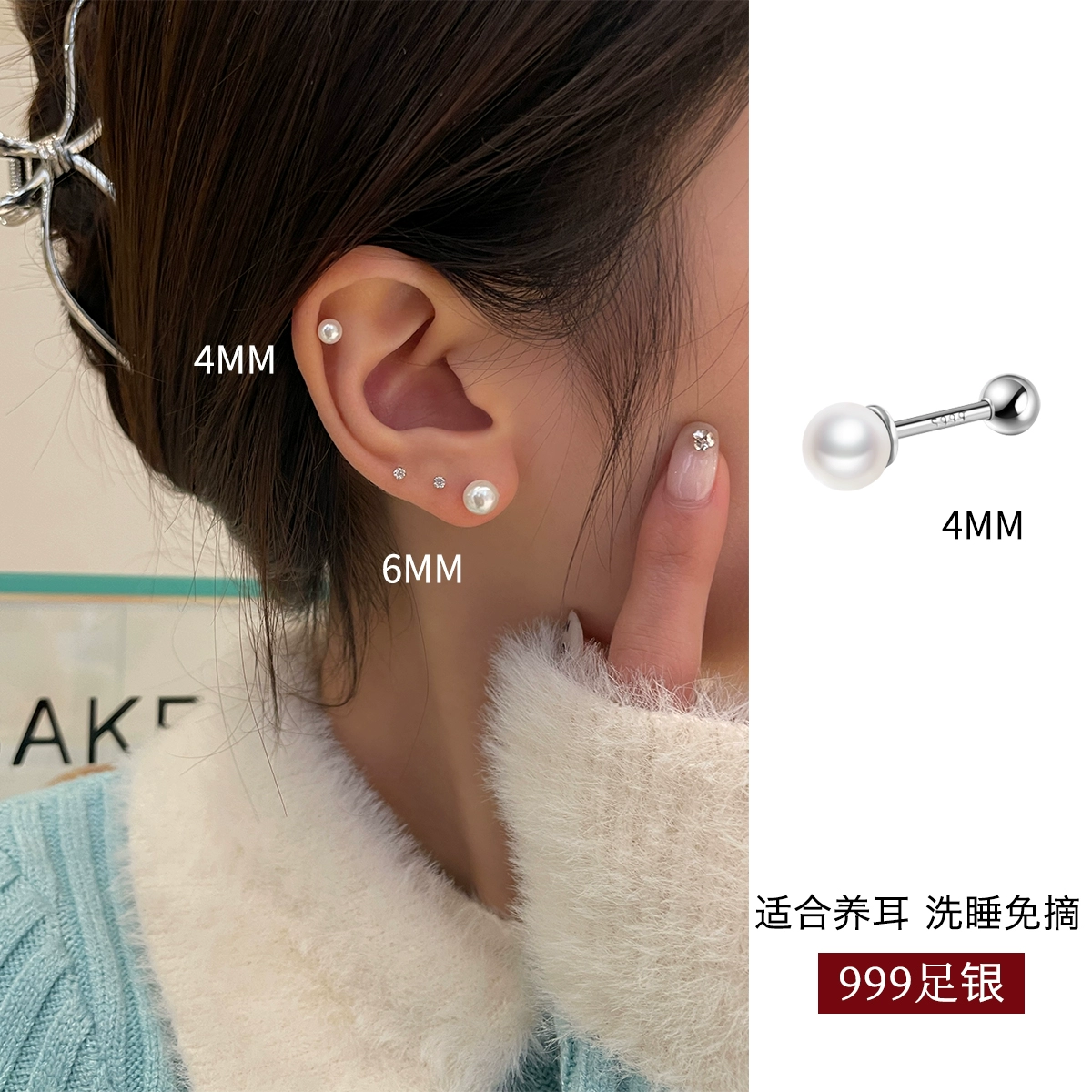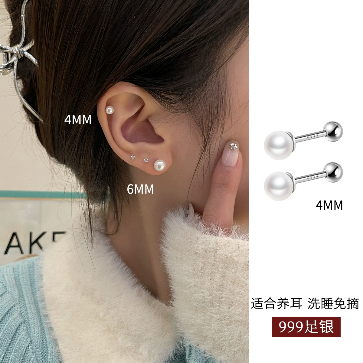 Women’s sterling silver screw-free pearl earrings for sleeping