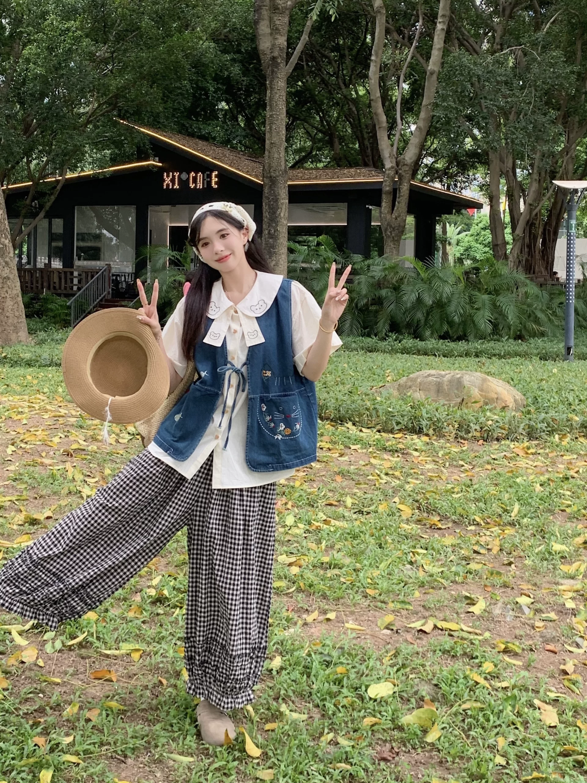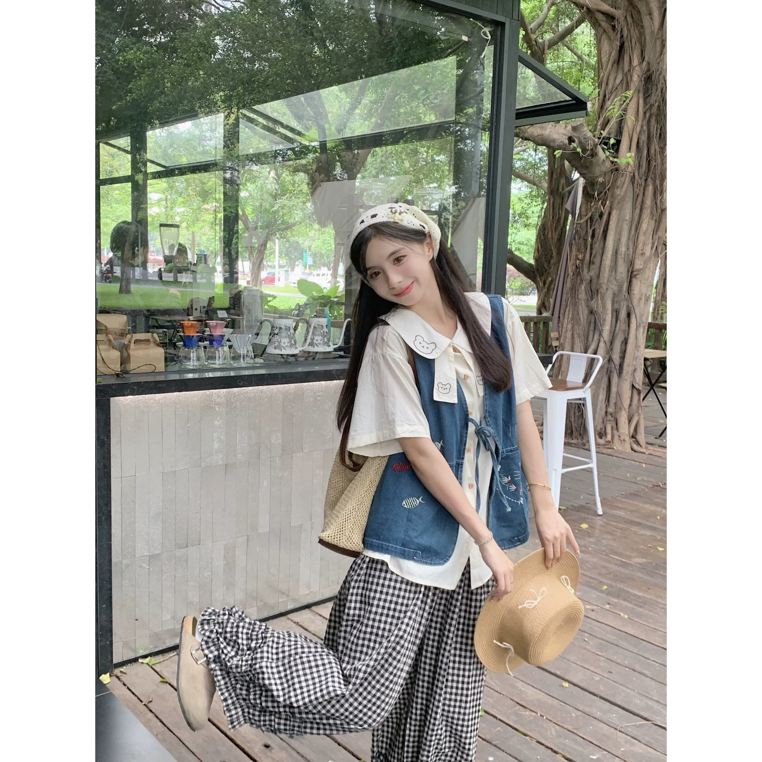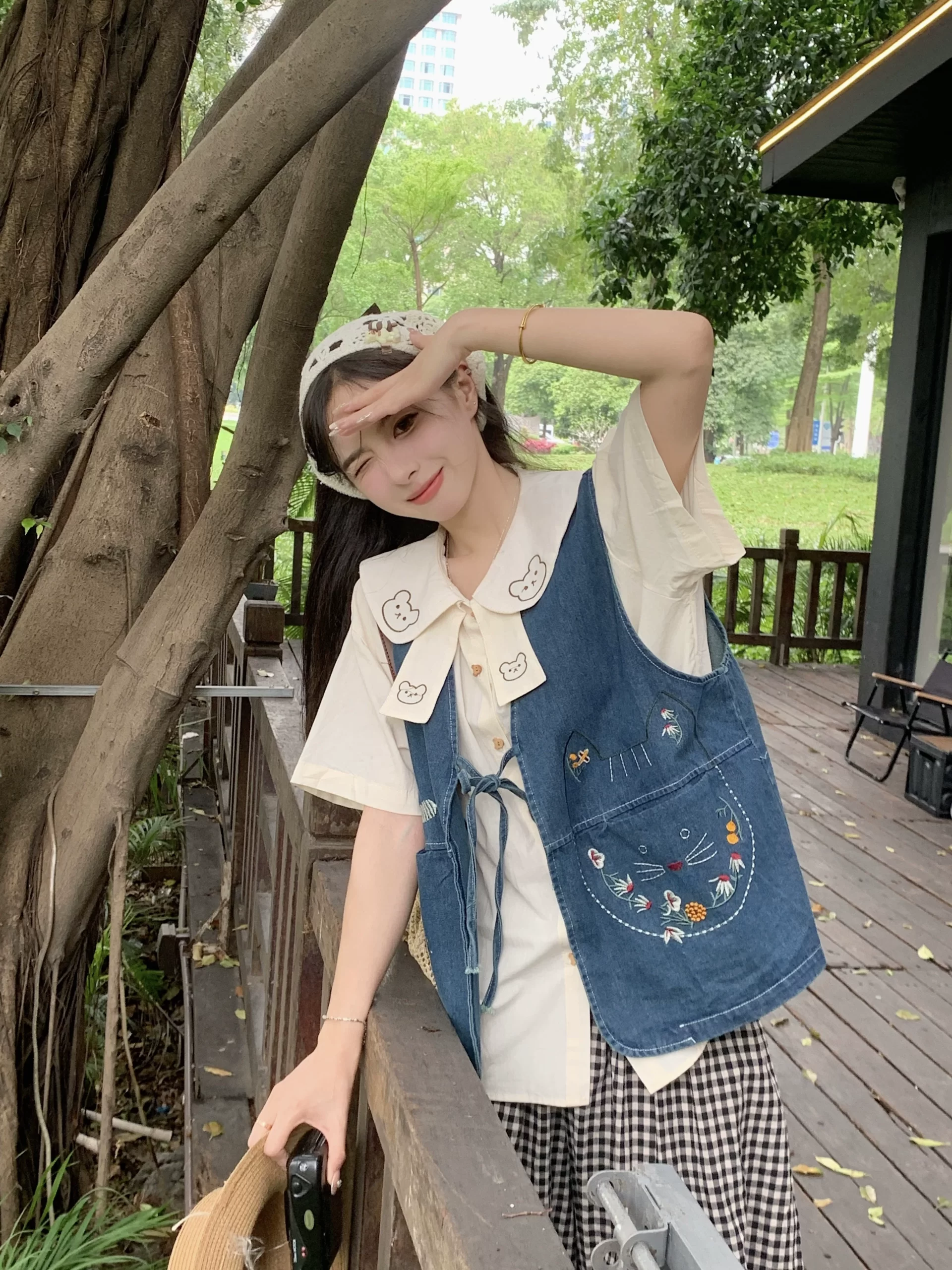 Women's summer bear denim vest doll collar shirt