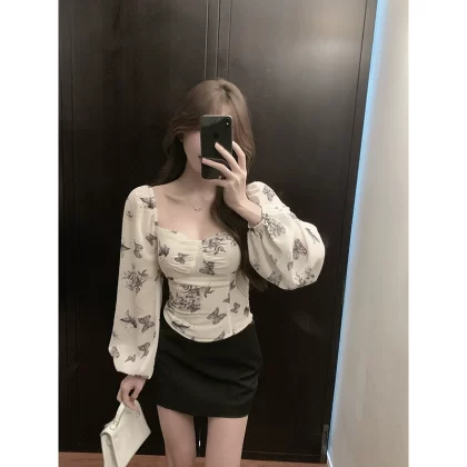 Women’s summer French style waist slimming long-sleeved T-shirt