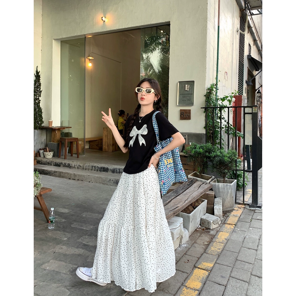 | nameOriginal | Women's summer short-sleeved T-shirt with polka dot bow print |