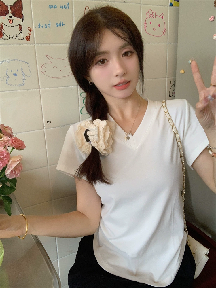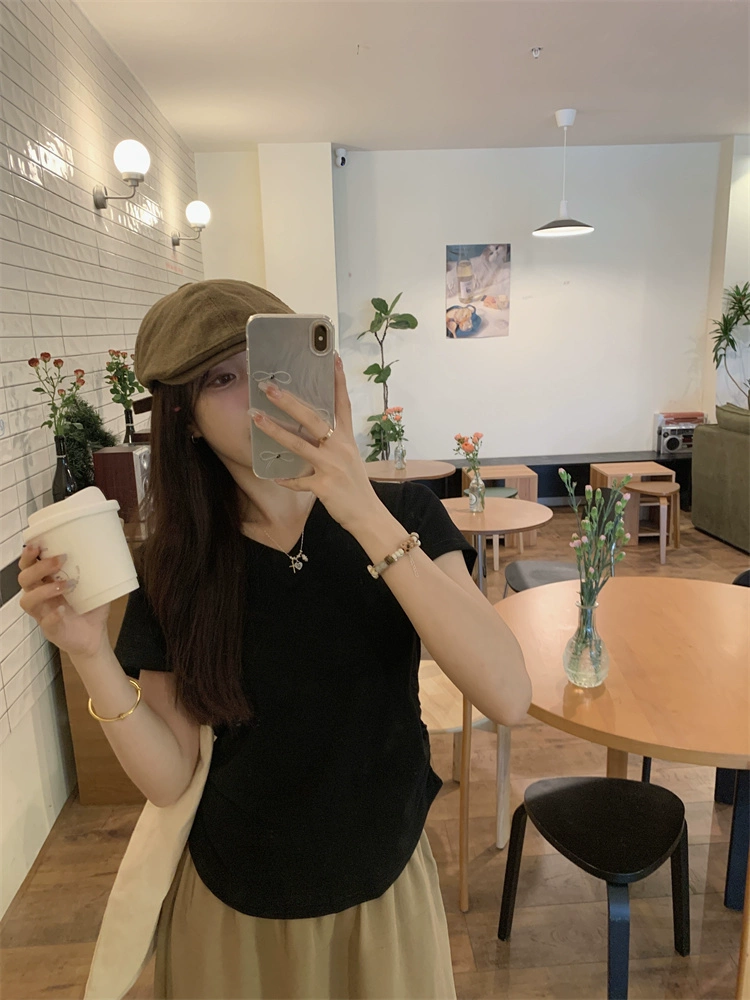 | nameOriginal | Women's T-shirt V-neck slightly fat right shoulder high waist slim short sleeve |