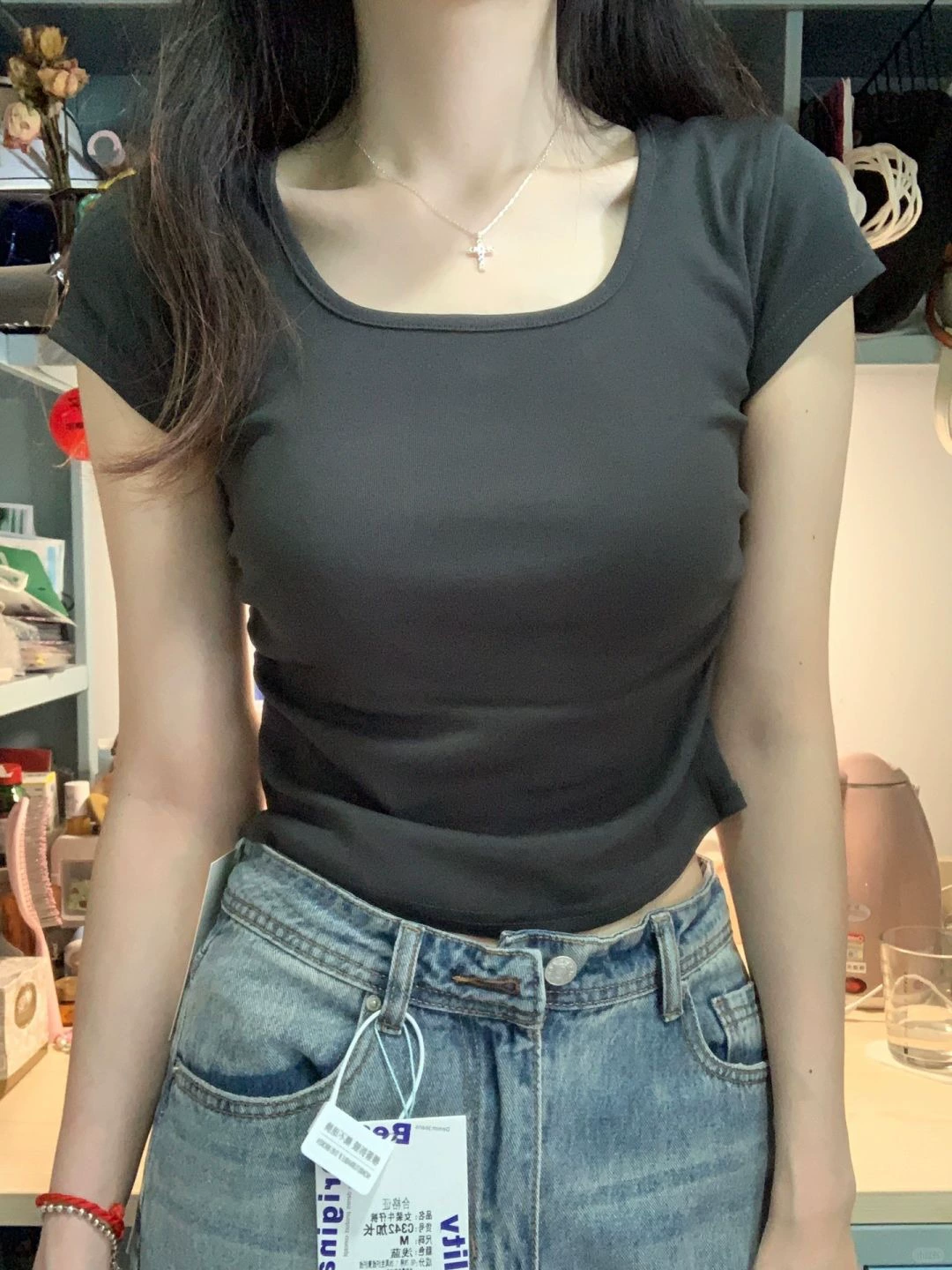 | nameOriginal | Women's U-neck pure desire slim fit short top pinch waist T-shirt |