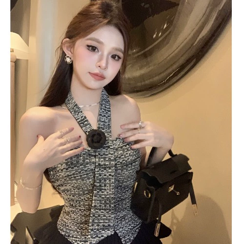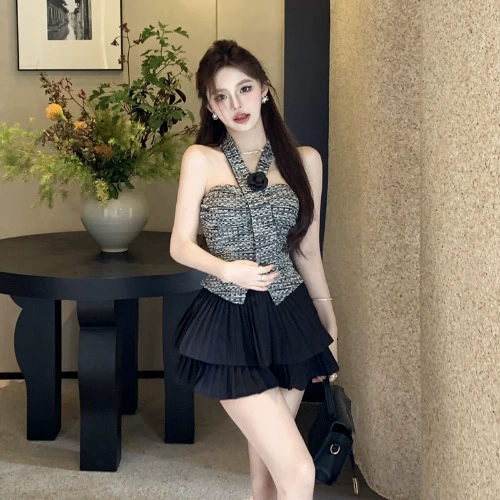 Women’s vest wearing camellia halter neck skirt and trousers breast