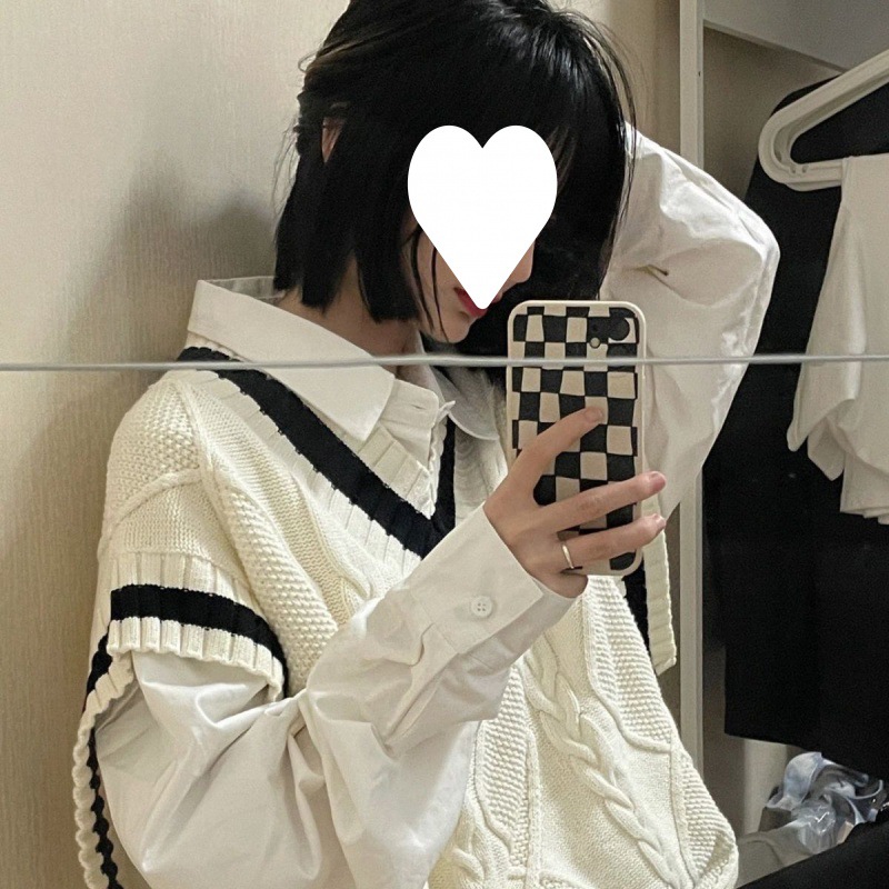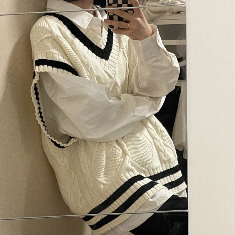 Women’s Vest Two-piece Suit Spring and Autumn College-style Collar Sweater Knitted Vest Loose Stacked Long-sleeved Trendy Shirt