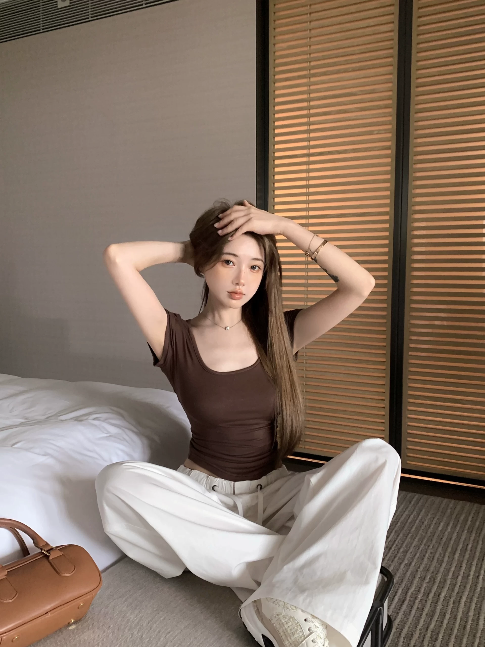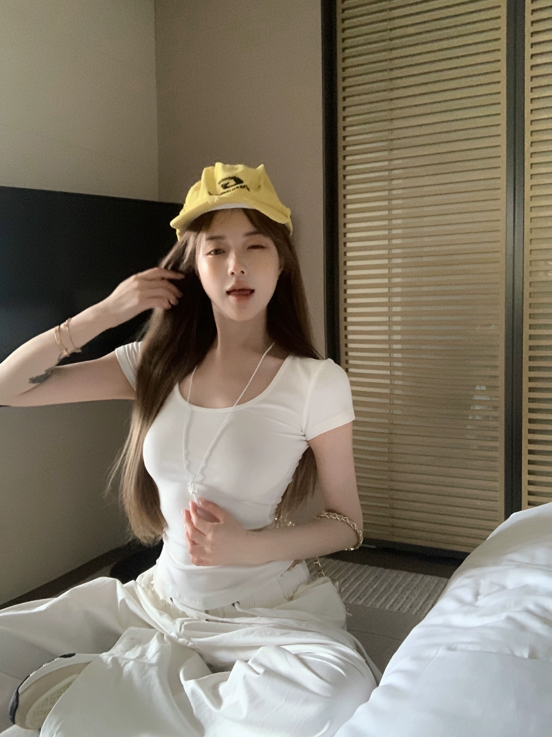 Women's White U Neck Short Sleeve Right Shoulder Summer Slim T-Shirt