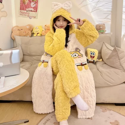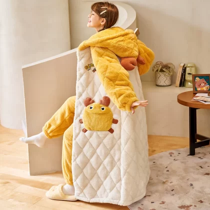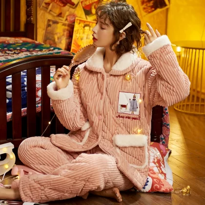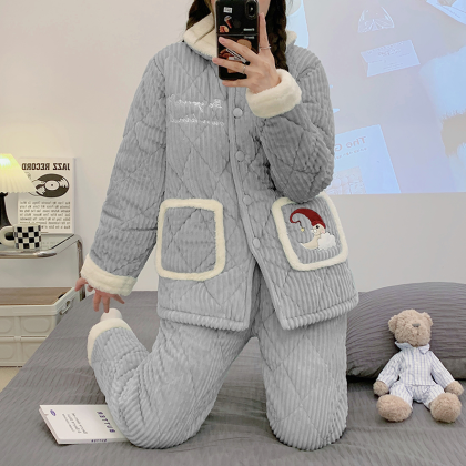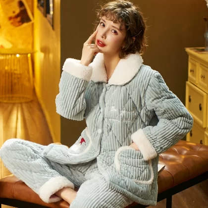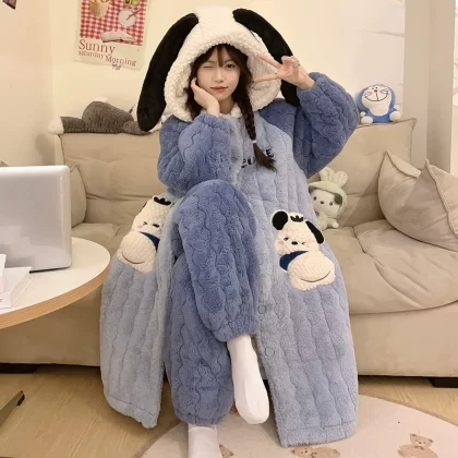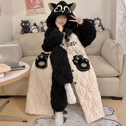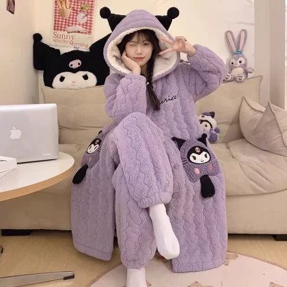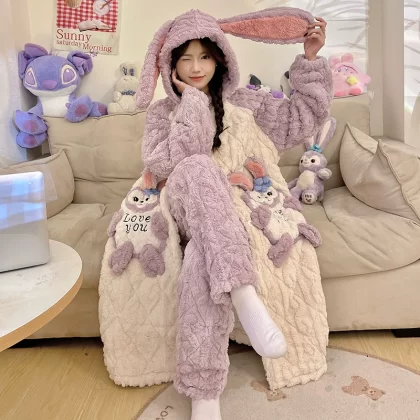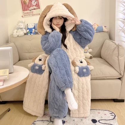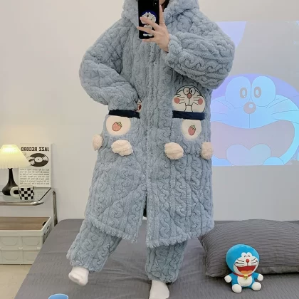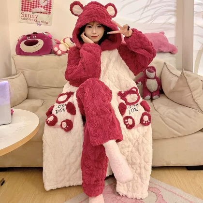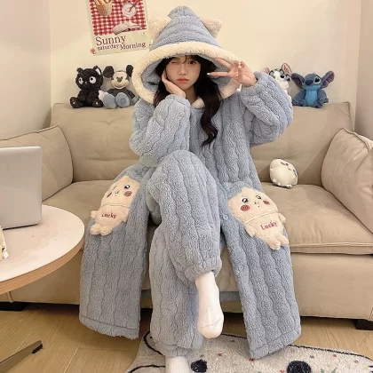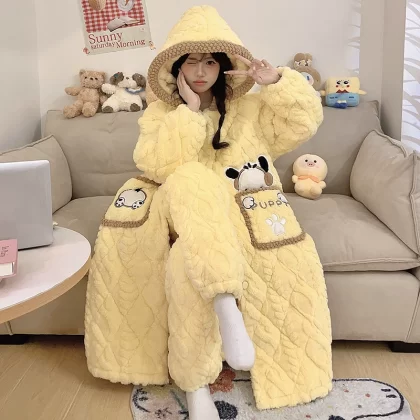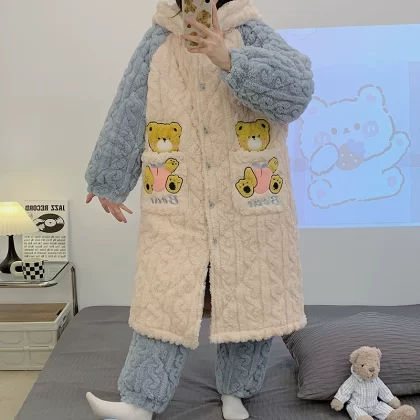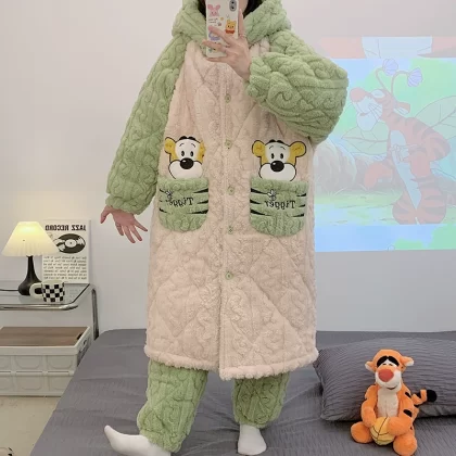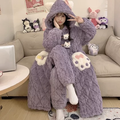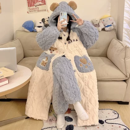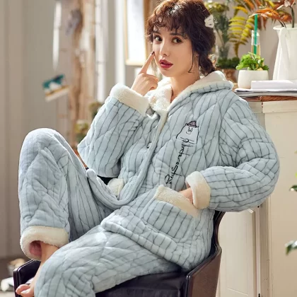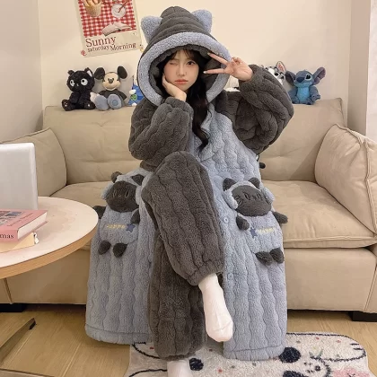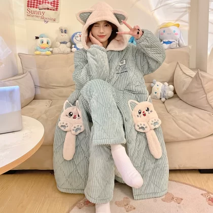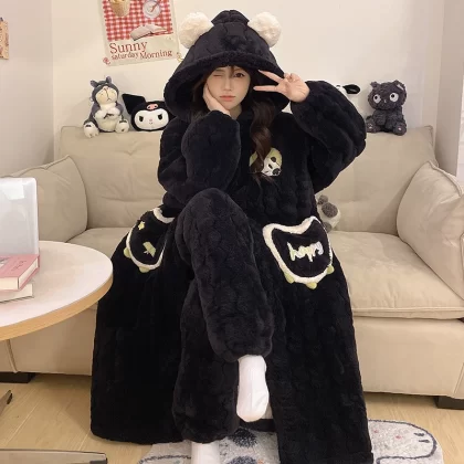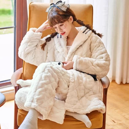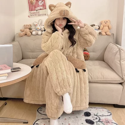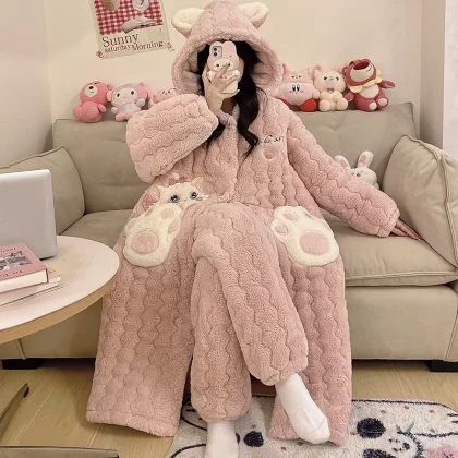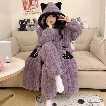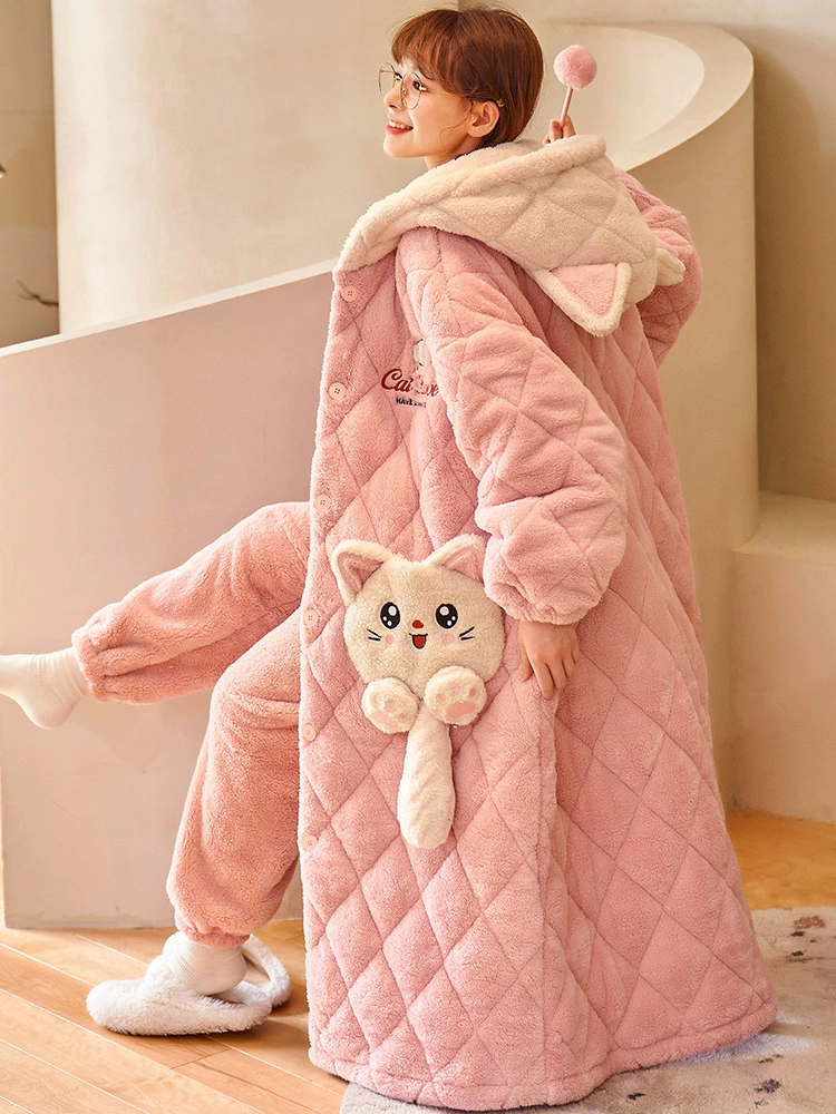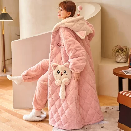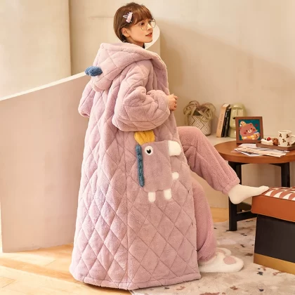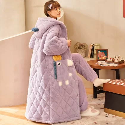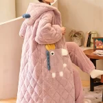 Women’s winter mid-length nightgown 2024 new three-layer quilted plus velvet thickened cute pajamas hooded home clothes