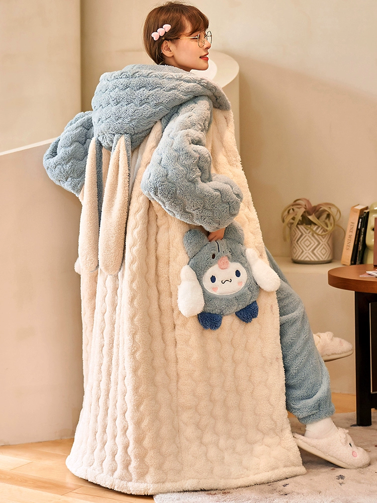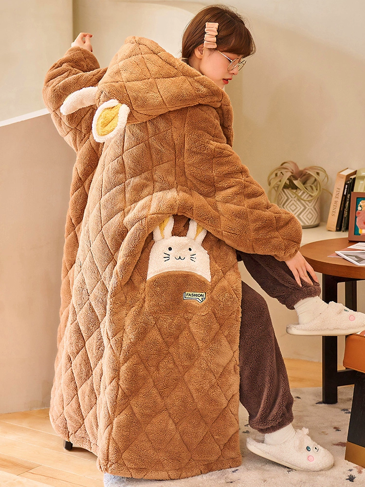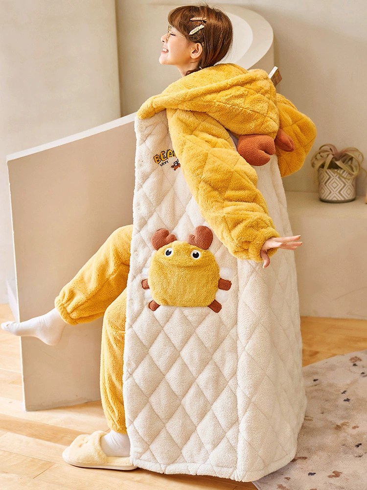 Women's winter mid-length nightgown 2024 new three-layer quilted plus velvet thickened cute pajamas hooded home clothes