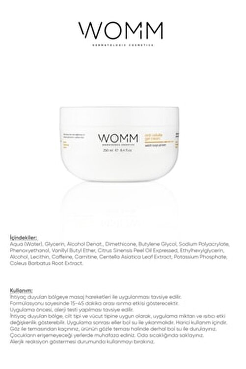 Womm Anti Cellulite Gel Cream Rich in carnitine and caffeineThis complex helps to reduce the appearance of orange peel, which is formed due to the accumulation of fat on the skin. It contains components that make the skin resistant to UV light. It prevents irritation of the skin during cellulite care. 250 ml Product Content: Procontour Plant Complex, Orange Oil, Glycerin Ingredients/Ingredients: Aqua (Water), Glycerin, Alcohol Denat., Dimethicone, Butylene Glycol, Sodium Polyacrylate, Phenoxthanyeol, Vanillyl Butyl Ether, Citrus Sinensis Peel Oil Exposed, Ethylhexylglycerin, Alcohol, Lecithin, Caffeine, Carnitine, Centella Asiatica Leaf Extract, Potassium Phosphate, Coleus Barbatus Root Extract. Usage: Applied by massage movements to the area needed. Thanks to the assets contained in it, the warming effect of 15-45 minutes will be rewarding. Warming and heat resistance vary individually. Before application, allergy test is recommended. * ALL OF OUR PRODUCTS ARE DERMATOLOGICALLY TESTED.