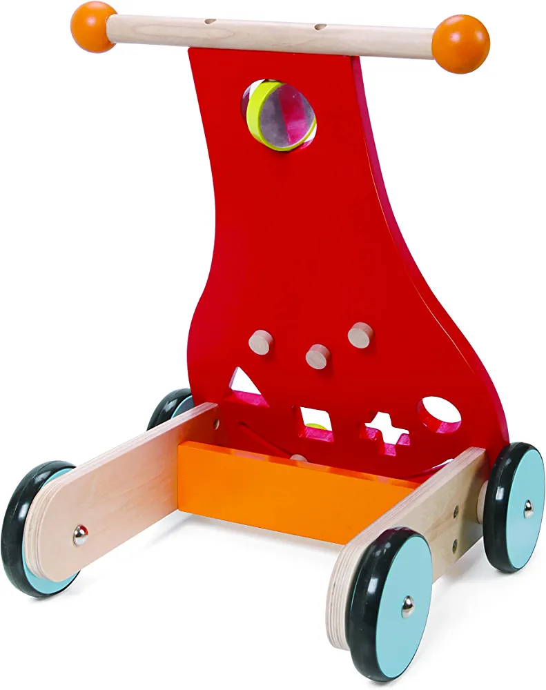 Wooden Baby Walker with Activity Centre, Includes Xylophone, Shape Sorter, Gears, Mirror & Storage, 12 Months+, 34 x 34 x 47 cm.