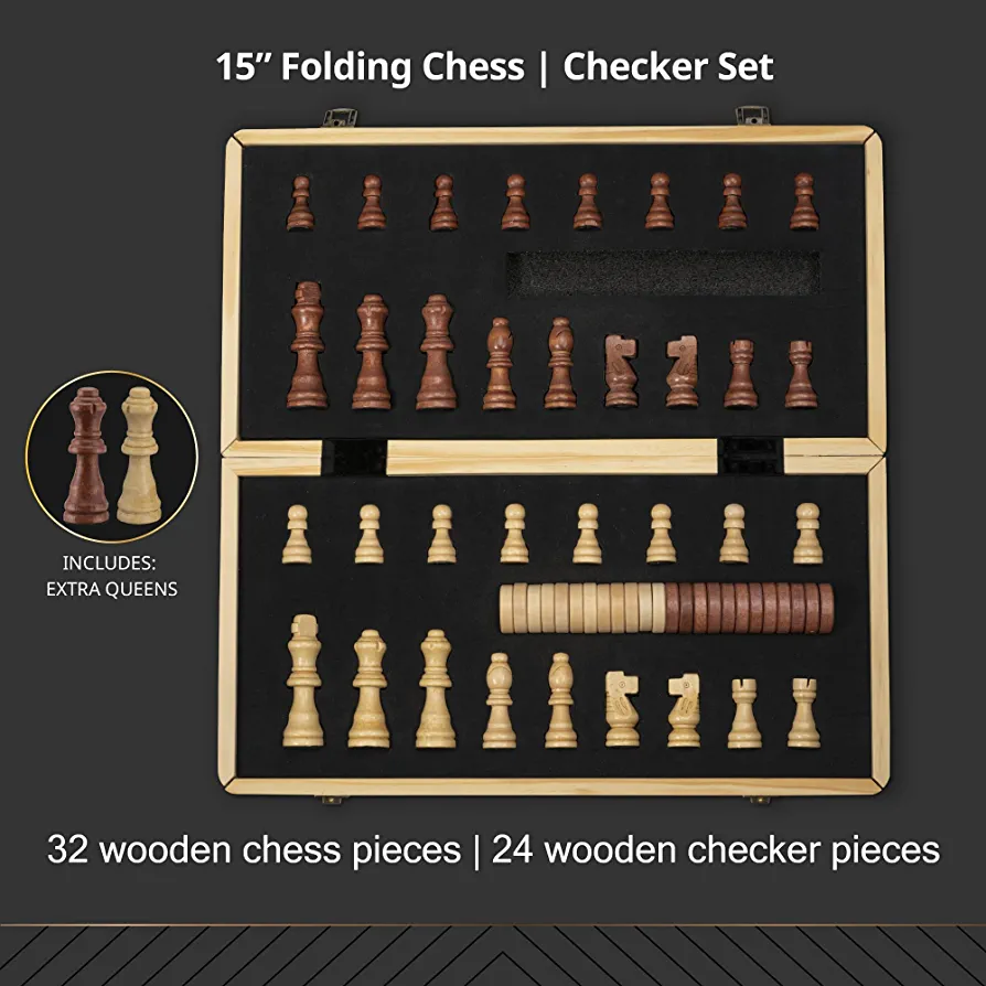 | nameOriginal | 15" Wooden Chess Sets – Chess & Checkers Board Game, with 2 Extra Queens, Wooden Chess Set, Chess Board Set, Chess Sets for Adults, Chess Sets for Adults & Kids, Checkers Game for Kids & Adults |