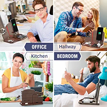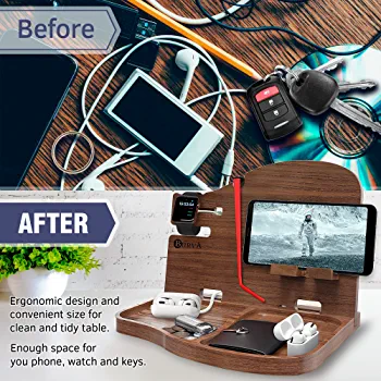 ALL IN ONE PLACE Night Stand Charger Station. Phone docking station watch organizer. Desk stand electronic organizer. Phone charging station tech organizer. Black desk organizer bedside tray. Compatible with Android Samsung Galaxy Apple iPhone iWatch. Item Dimensions 9.4" x 8" x 8.2"