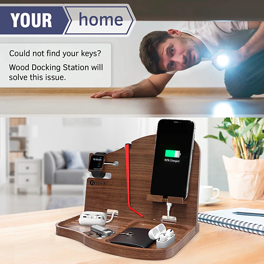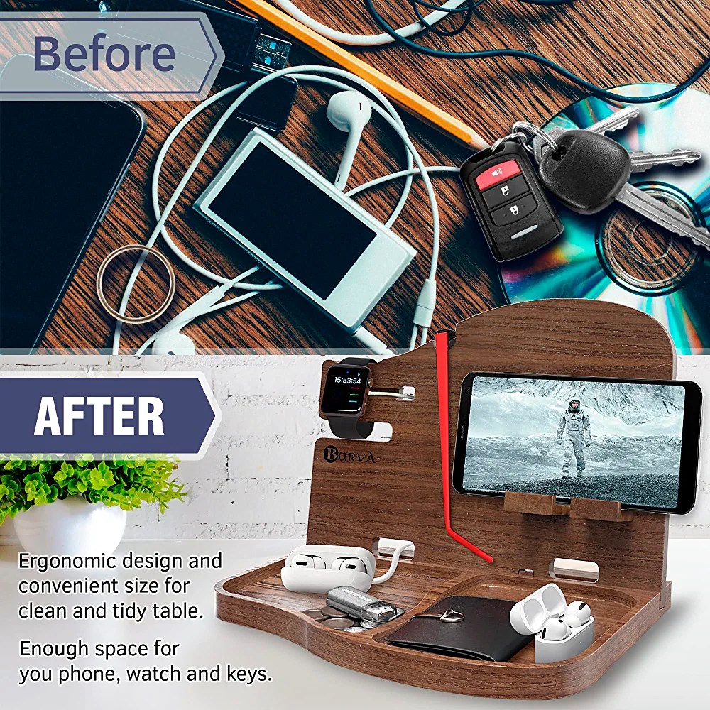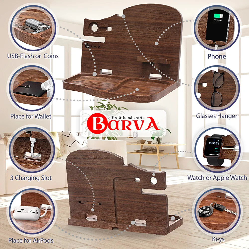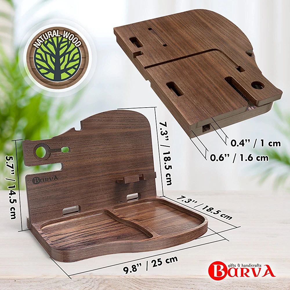 BarvA Wood Docking Station Nightstand Organizer Phone Wallet Watch Stand Key Holder Bed Caddy Charging Dock Desk Accessories Bedside Caddy Birthday Gifts for Men Home Organization Side Table