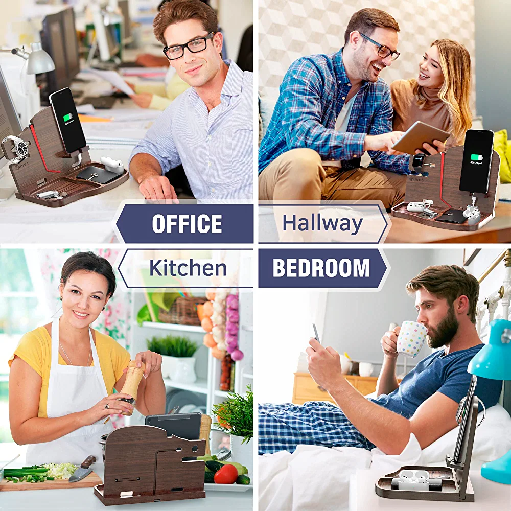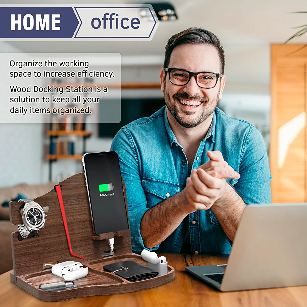 Wooden multi-functional organizer for bedside or desk with charging dock, key holder, and compartments for phone, wallet, and watch. Ideal for home organization and as a gift for men.