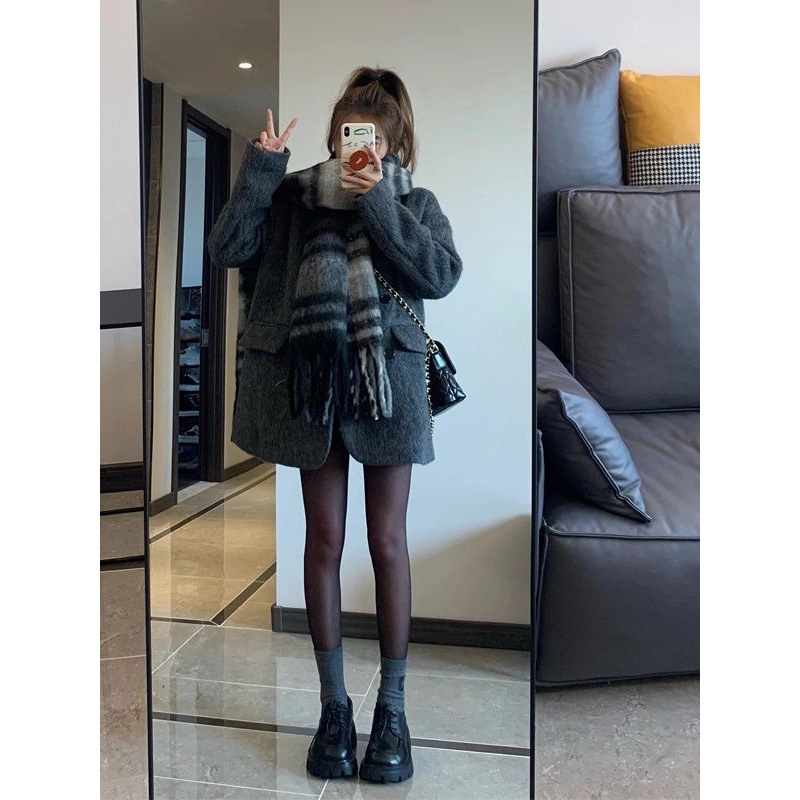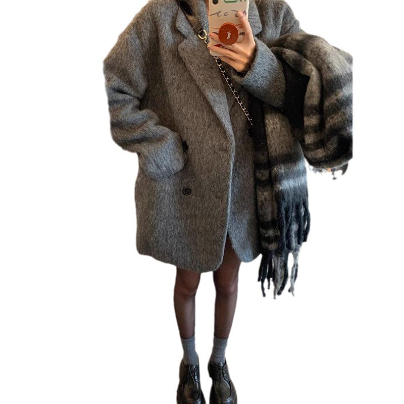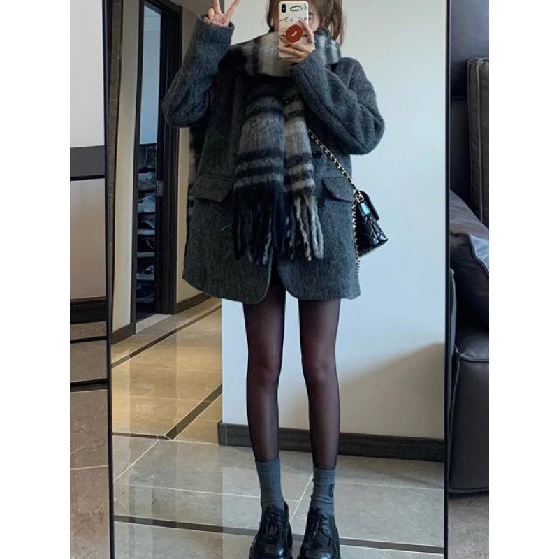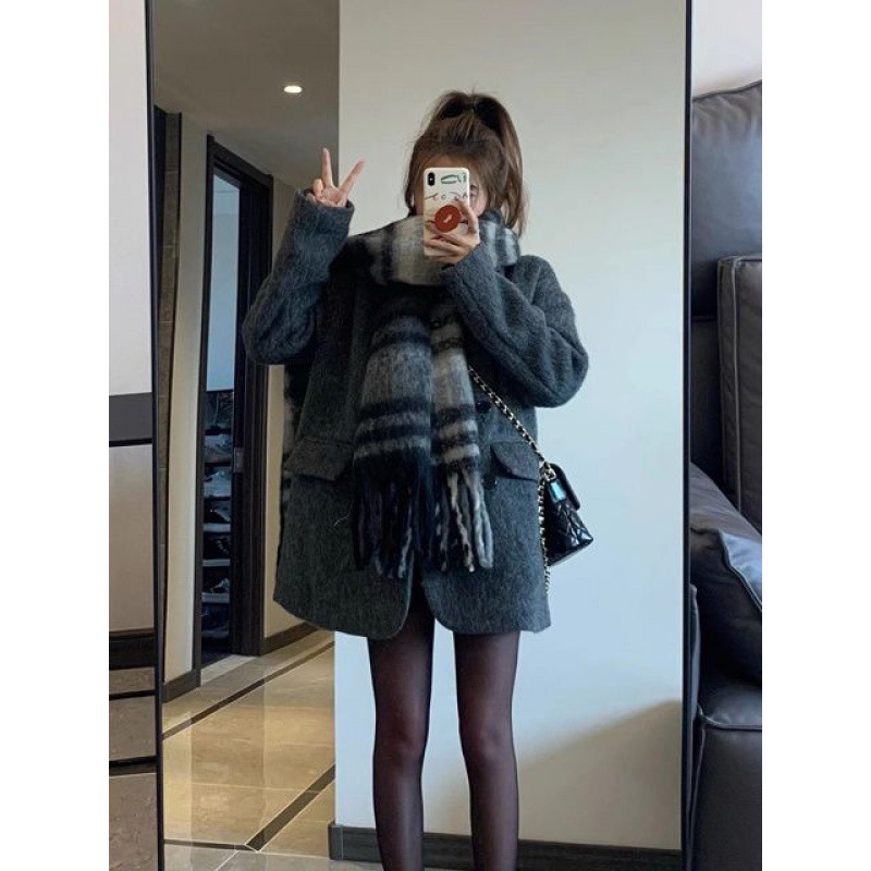 Woolen gray suit jacket for women autumn and winter New style small slimming mid-length woolen coat fashion