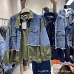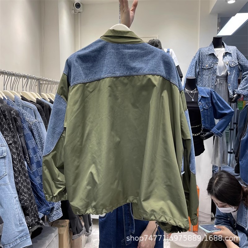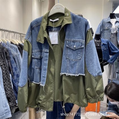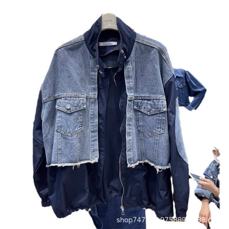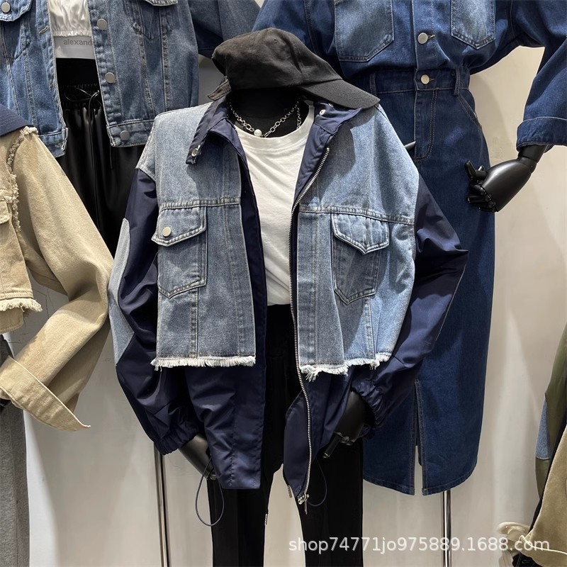 Workwear stitching Denim coat for women Spring and Autumn new design sense fake two-piece loose drawstring waist tight long sleeve jacket fashion