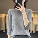 Worsted wool round neck sweater women’s 2023 Summer waffle 3/4 sleeve bottoming shirt loose slimming women’s top