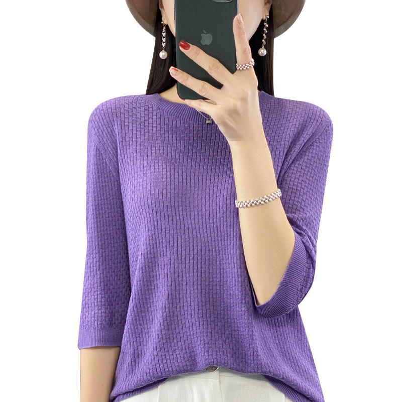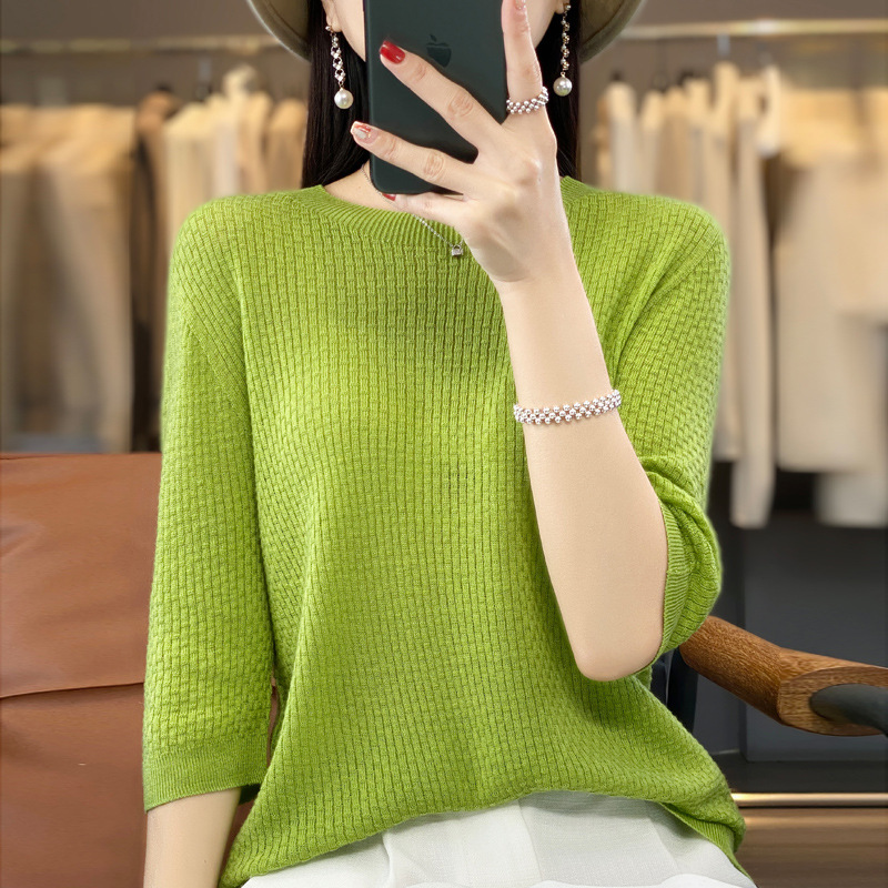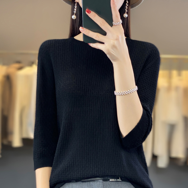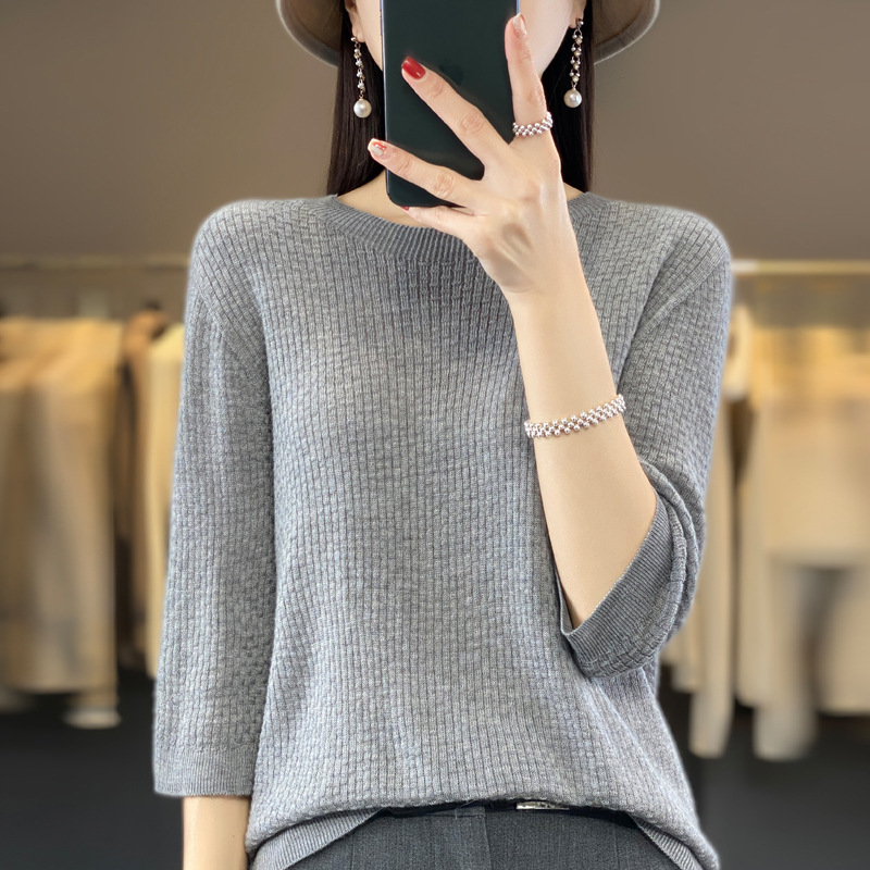 Worsted wool round neck sweater women's 2023 Summer waffle 3/4 sleeve bottoming shirt loose slimming women's top