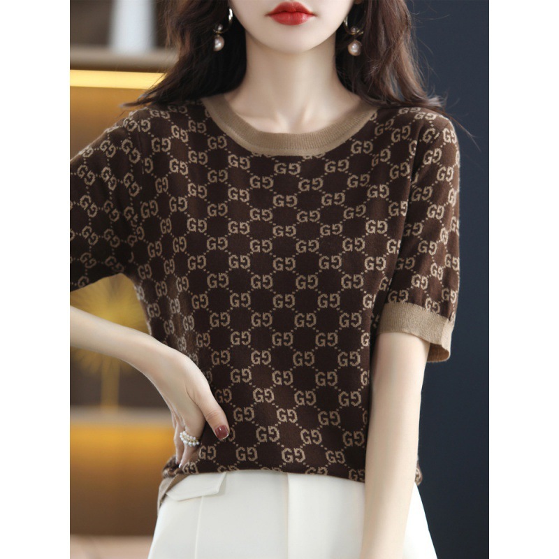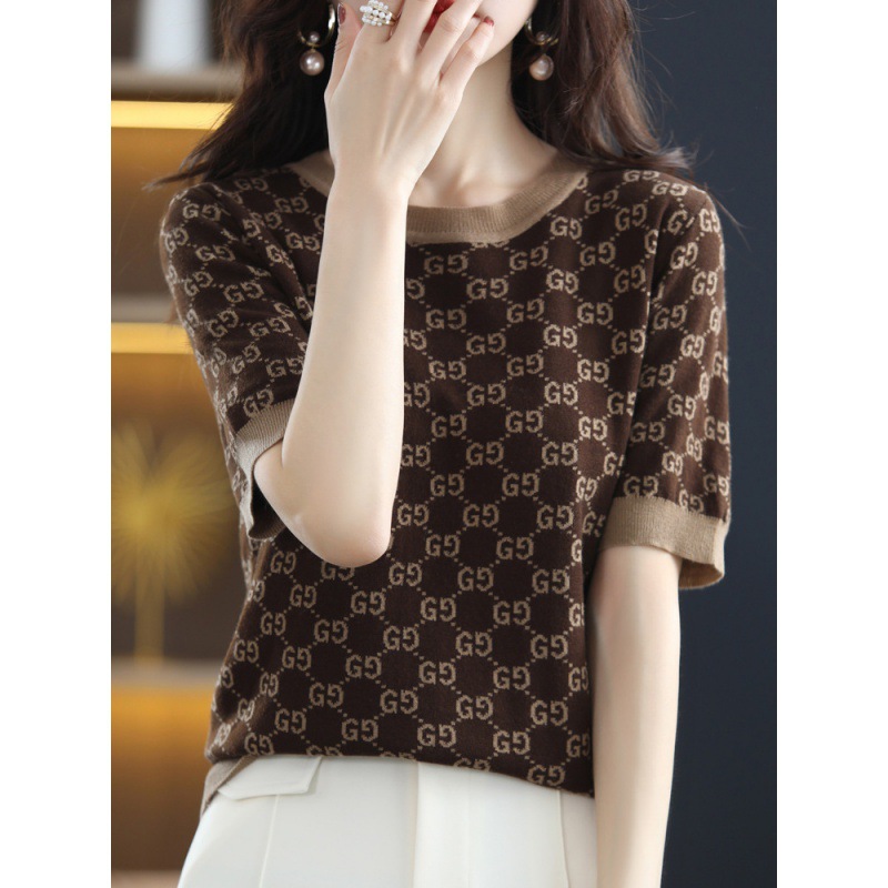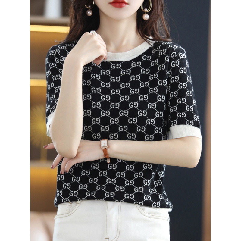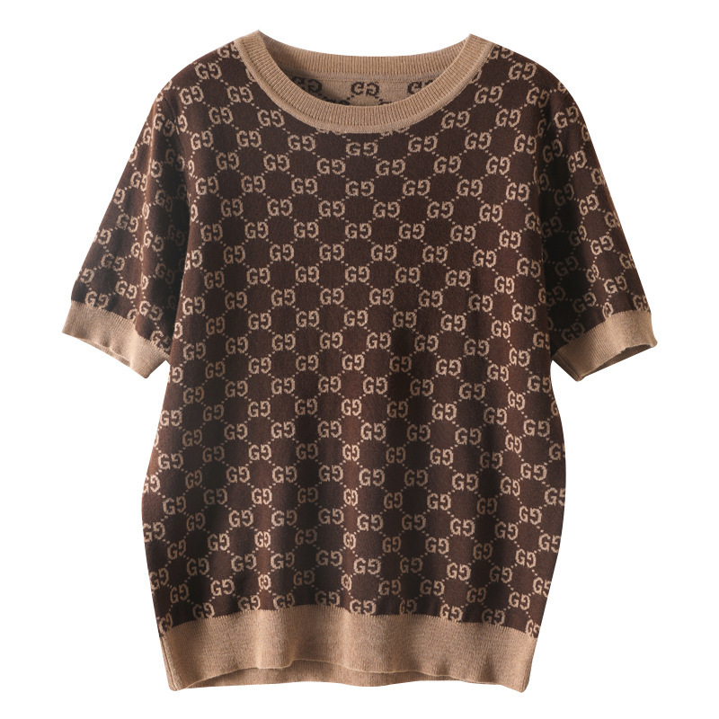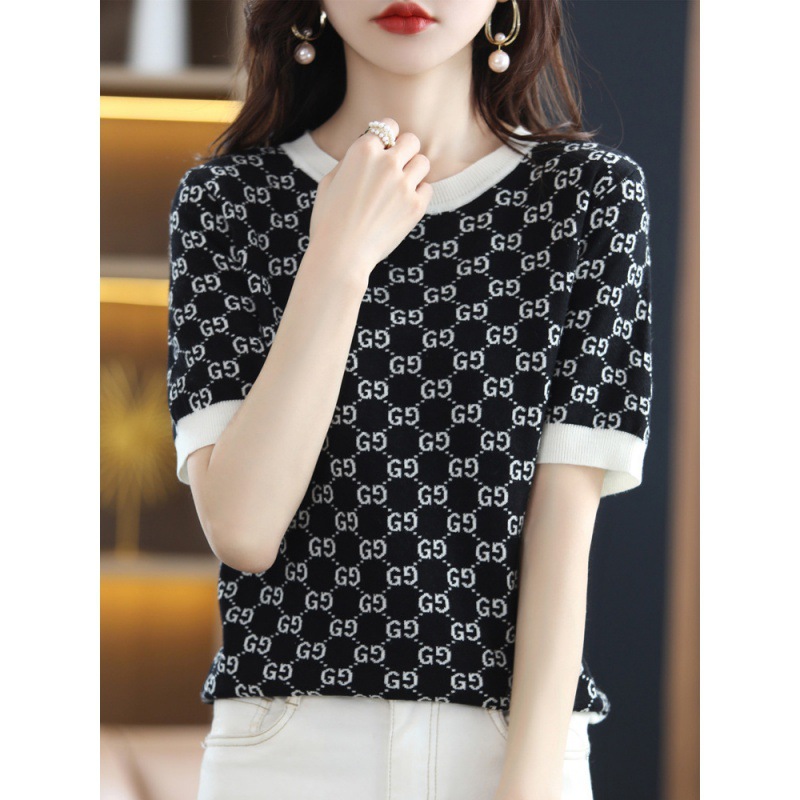 | nameOriginal | Worsted Wool Short Sleeve Women's Crewneck Jacquard Knitted Shirt Half Sleeve All-match Spring and Summer Pullover Top T-shirt Base |