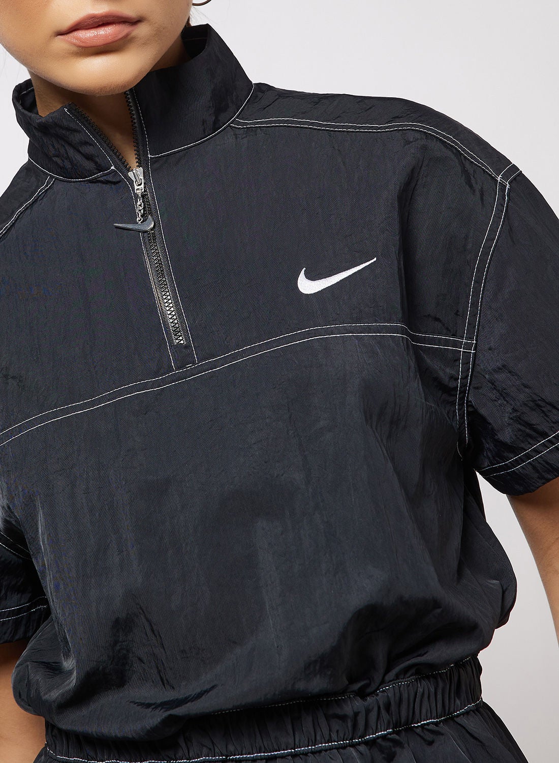 This product features a gentle and airy nylon material that is comfortable to wear. It has a high neckline with a half zipper placket and an elasticated waist that creates a flattering cinched waist look. To maintain its quality, please follow the care label instructions when washing. The Nike signature branding detail adds a touch of style to this piece. The model is approximately 174cm tall and is wearing a size S.