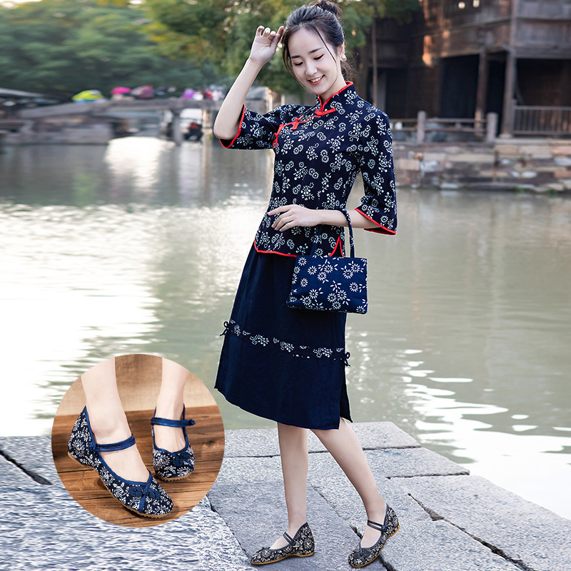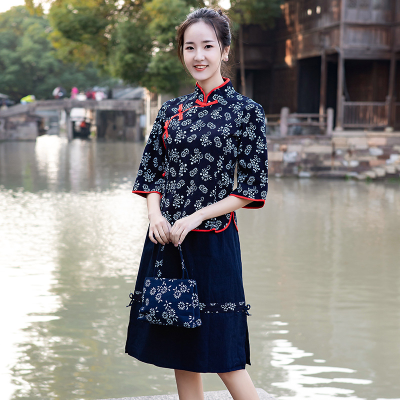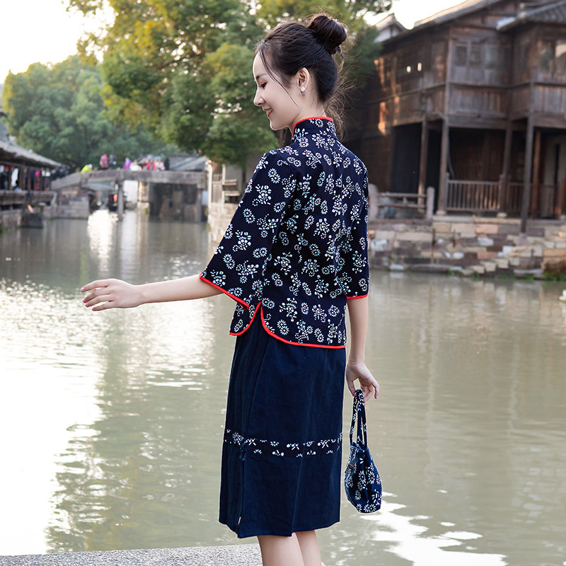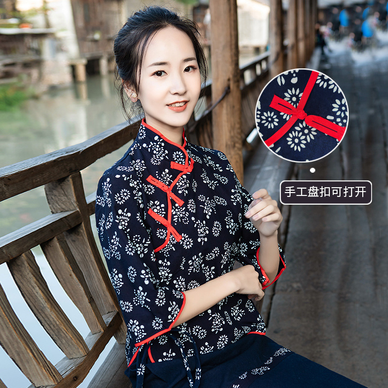 | nameOriginal | Wuzhen Pure Cotton Blue Printed Cloth Spring and Autumn Tang Suit Red Buckle Seven-point Horn Sleeve Top Women's Performance Work Clothes |