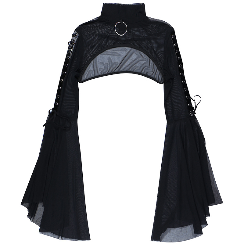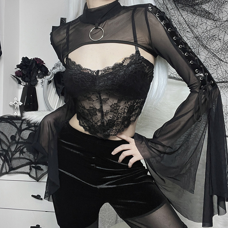 | nameOriginal | WY22024 elegant see-through mesh top women's dark style half turtleneck bell sleeve bilateral ribbon slim waistcoat |