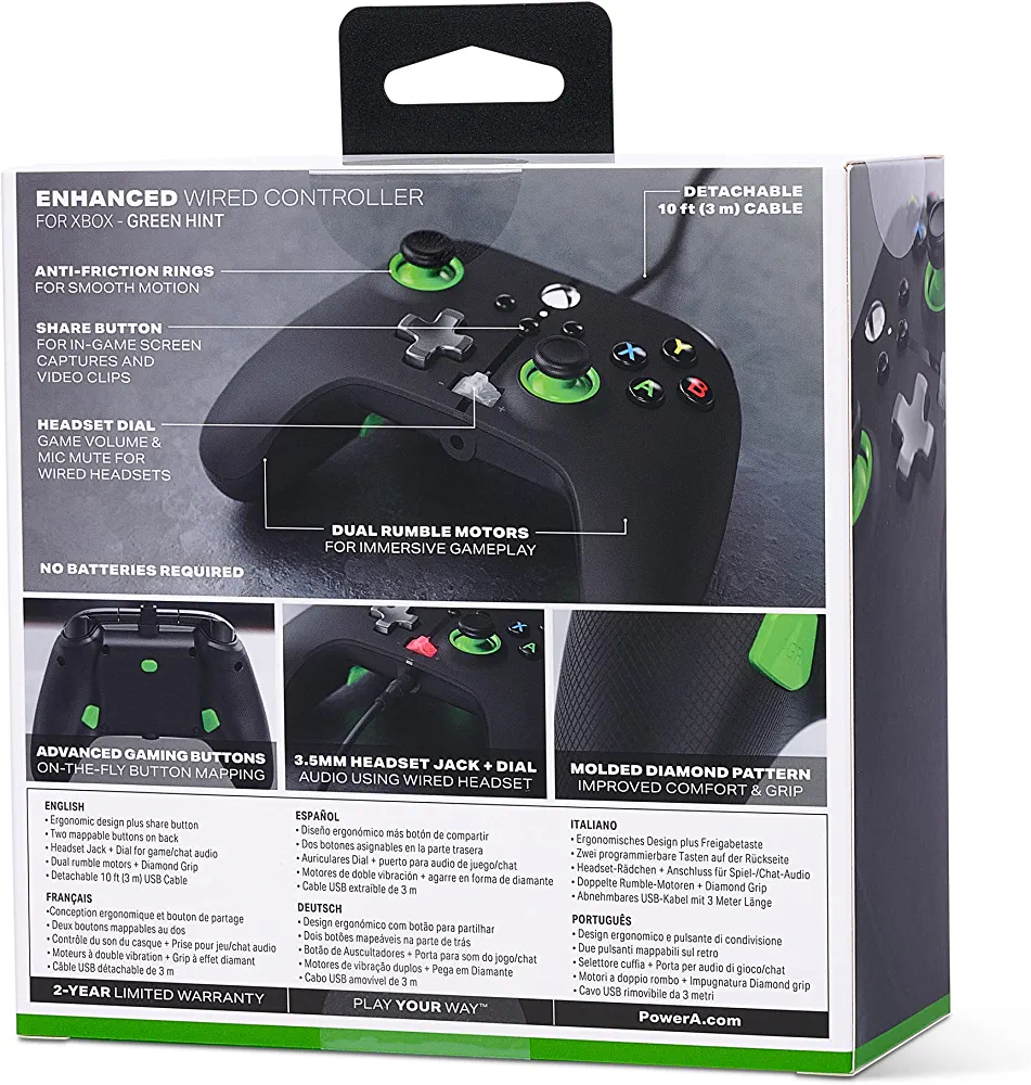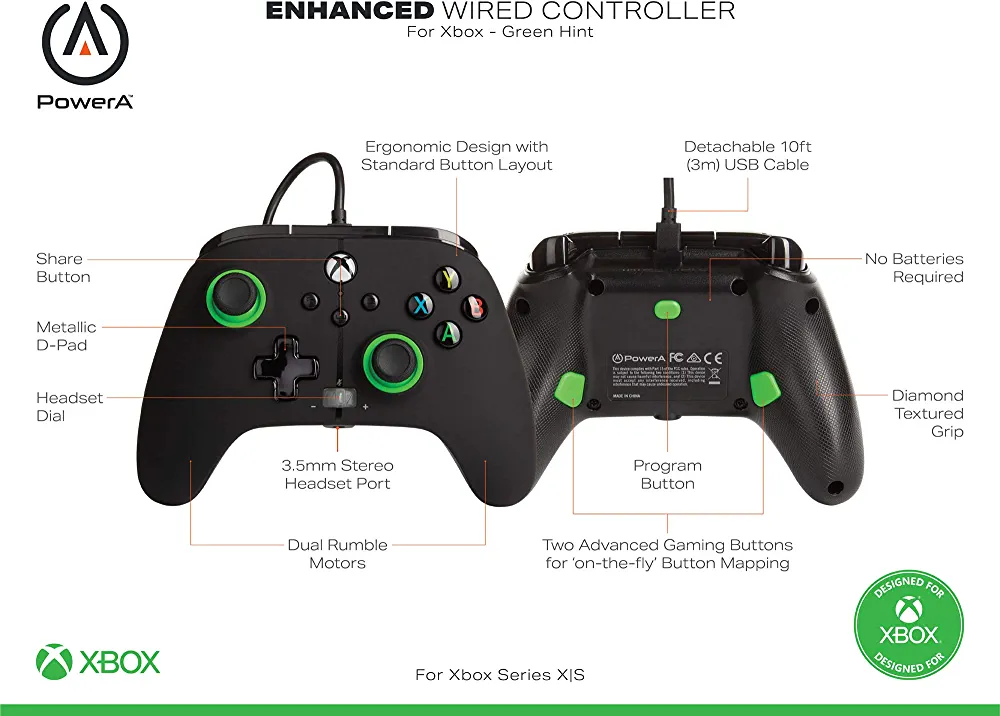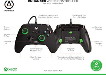 Introducing the PowerA Enhanced Wired Controller in Green Hint, designed to give you an edge over the competition. This officially licensed Xbox controller is compatible with Xbox Series X|S, Xbox One, and PC. It features two mappable Advanced Gaming Buttons that you can program quickly, even in the middle of the game. The controller is backed by PowerA for 2 years to reinforce our commitment to quality.