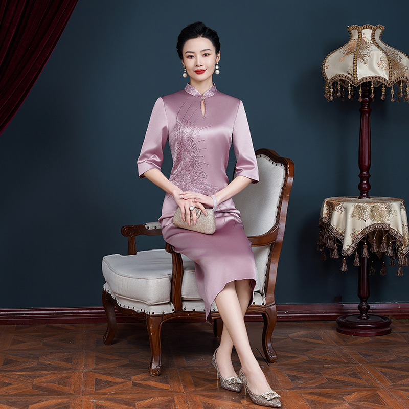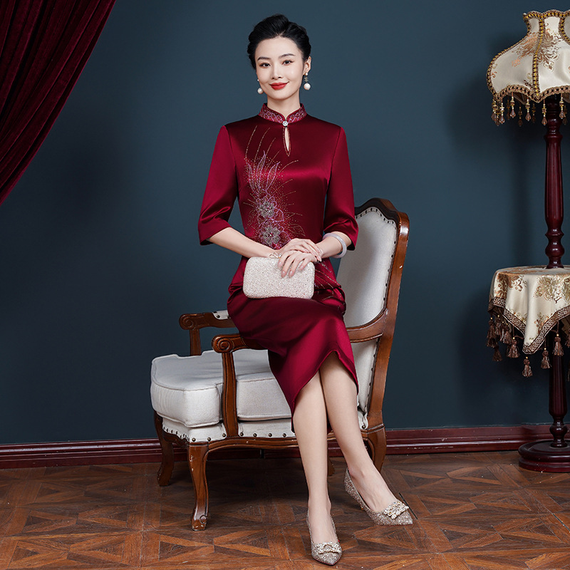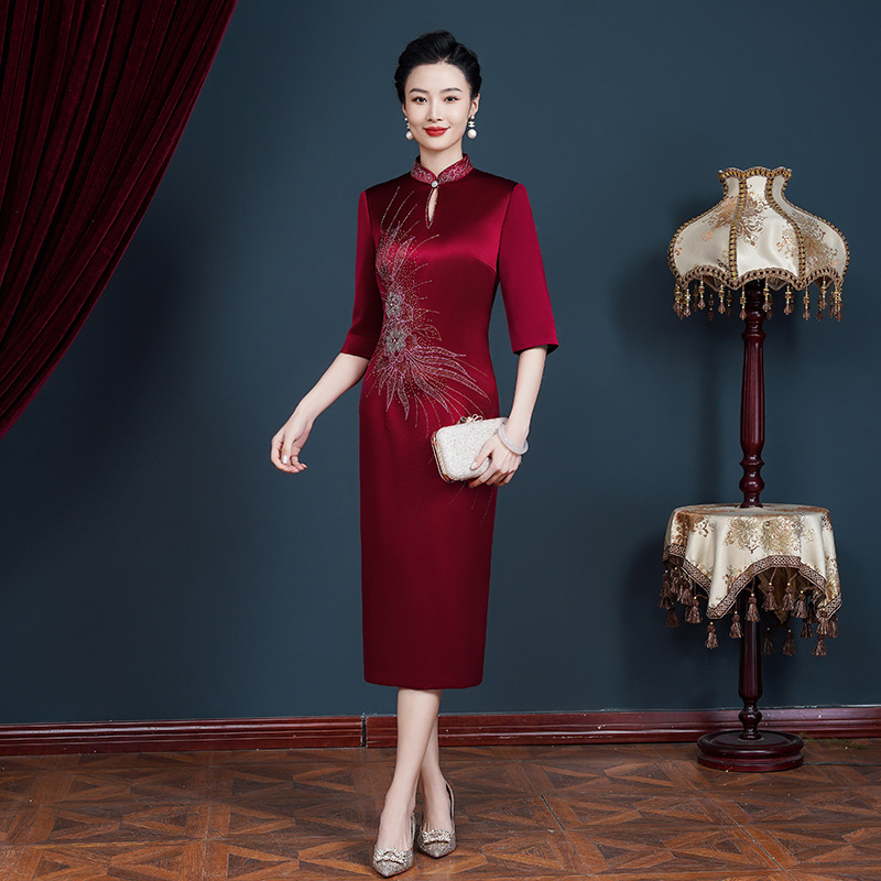 | nameOriginal | Xi mother-in-law wedding banquet toast dress Diamond-embedded dress Spring and Autumn New Mom mid-length cheongsam high-end elegant |