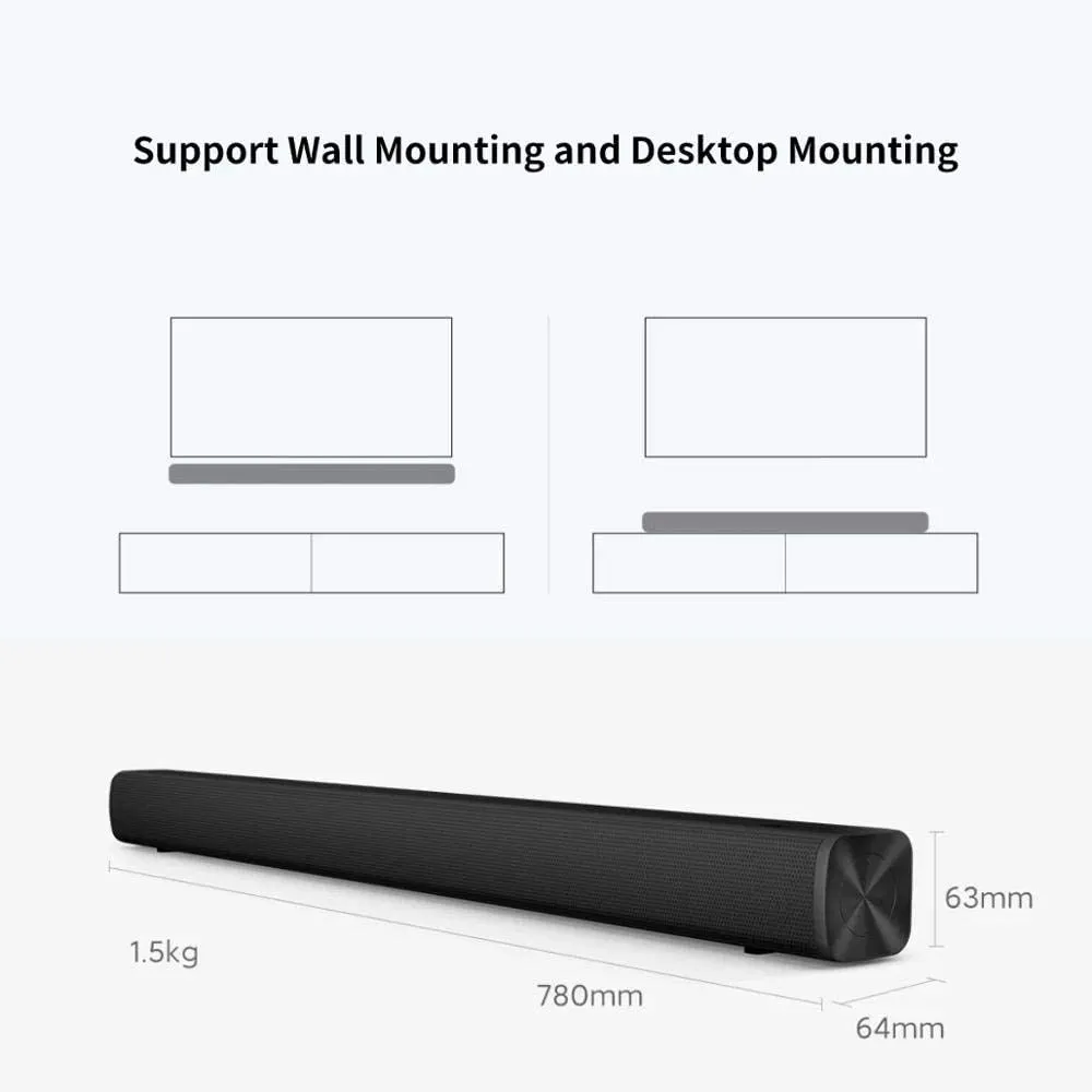 Introducing the NEW-Soundbar, the perfect addition to your Xiaomi Redmi TV! This SoundBar is designed to enhance your TV viewing experience with its powerful 30W audio output. It can be connected to your TV both wired and wirelessly via Bluetooth, giving you the flexibility to choose the best option for your setup. The SoundBar is also wall-mountable, allowing you to save space and create a sleek, modern look in your home theater. This product is specifically designed for Xiaomi TVs, ensuring compatibility and optimal performance. Upgrade your TV audio with the NEW-Soundbar and enjoy a cinematic experience from the comfort of your own home.