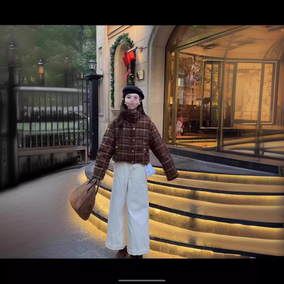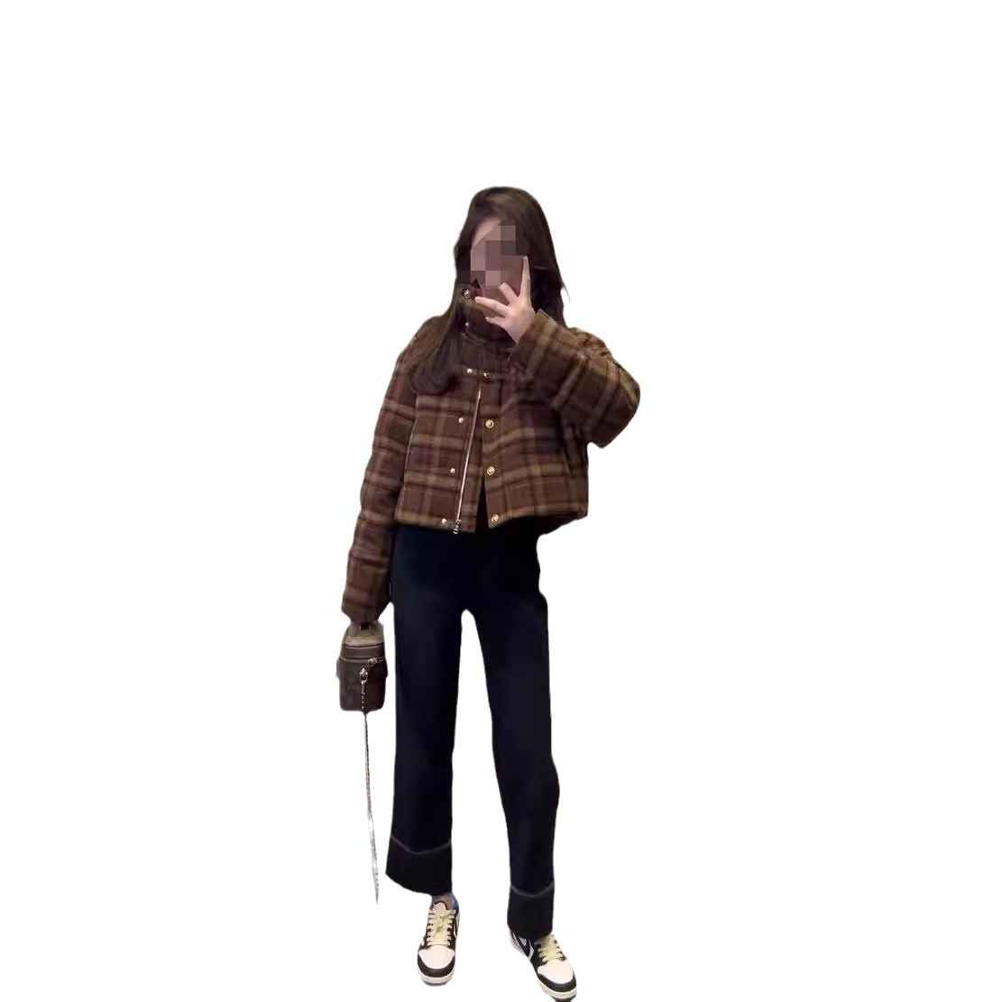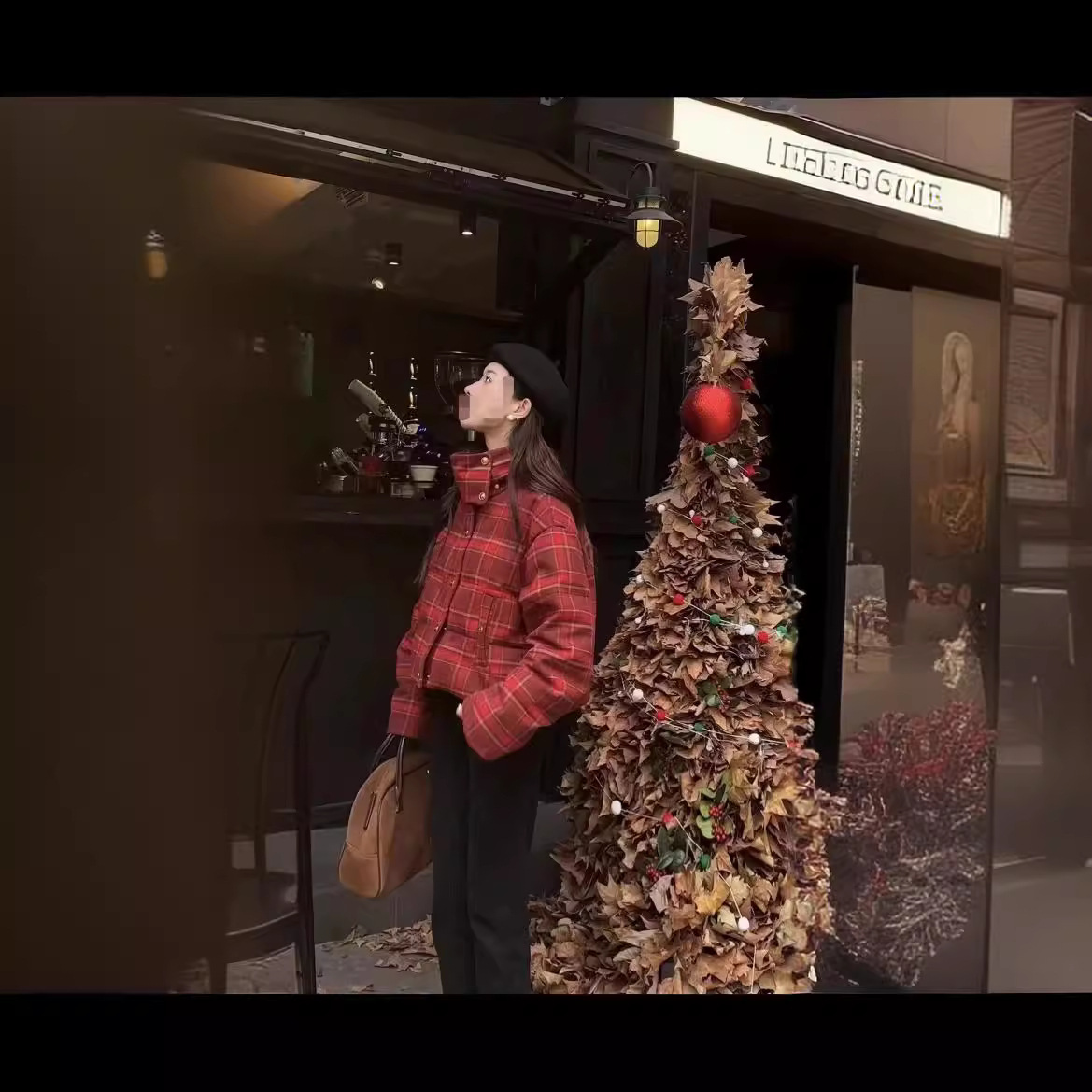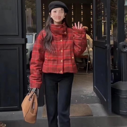 Xiaoxiang Style Age-reducing Vintage Chinese Red Plaid Down Jacket Women’s Winter Short Vertical Collar White Duck Down Bread Coat