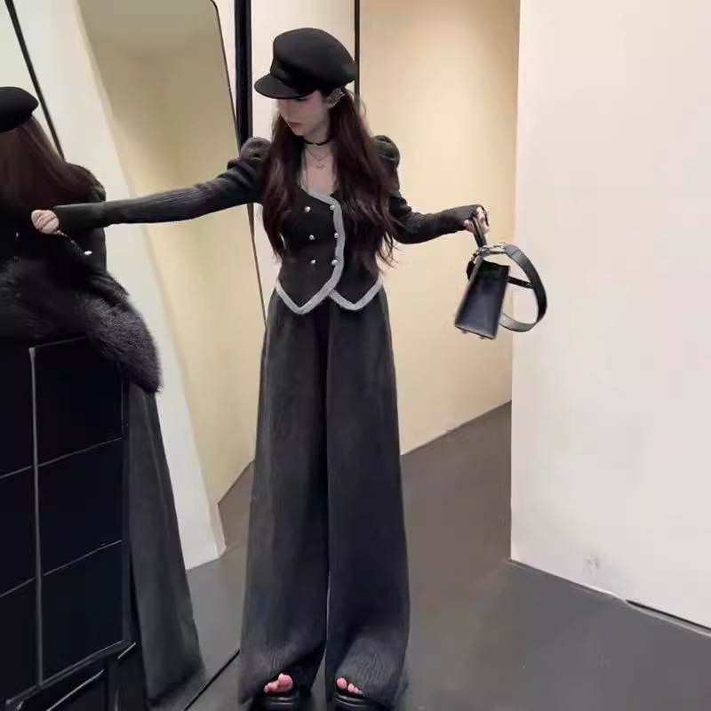 Xiaoxiang style knitted suit women’s spring and autumn clothes with a set of fashionable casual wide leg pants popular two-piece suit this year