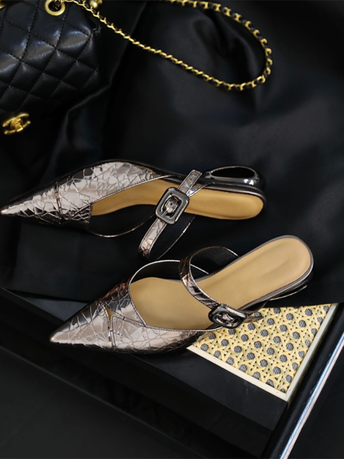 | nameOriginal | Xiaoxiang style silver one-button flat heel pointed toe mules |