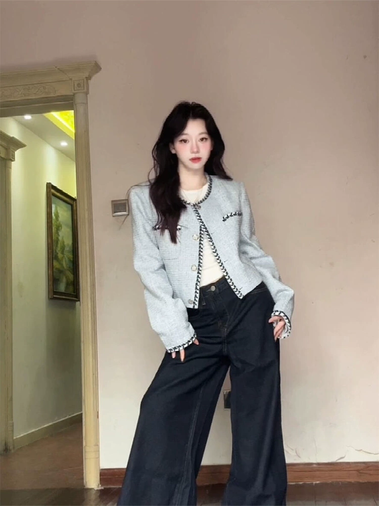 | nameOriginal | Xiaoxiangfeng blue high-end short round neck jacket |