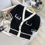 Xiaoxiangfeng contrast color V-neck ice silk top knitted cardigan