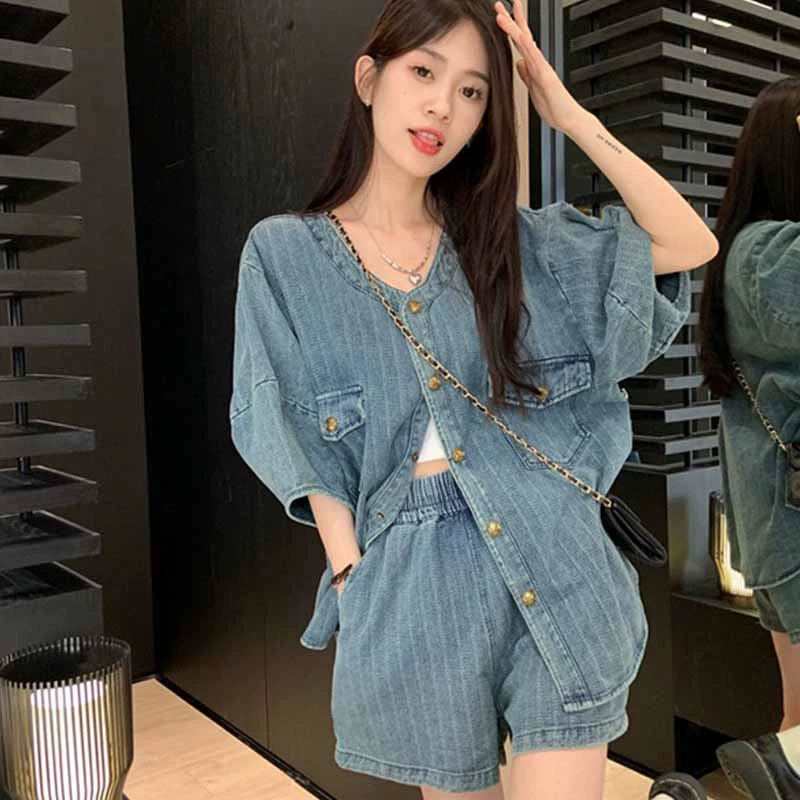 | nameOriginal | Xiaoxiangfeng Fashion Suit Women's Summer Loose Lantern Sleeve Short Sleeve Denim Jacket + Wide Leg Shorts Two-piece Trendy Set |