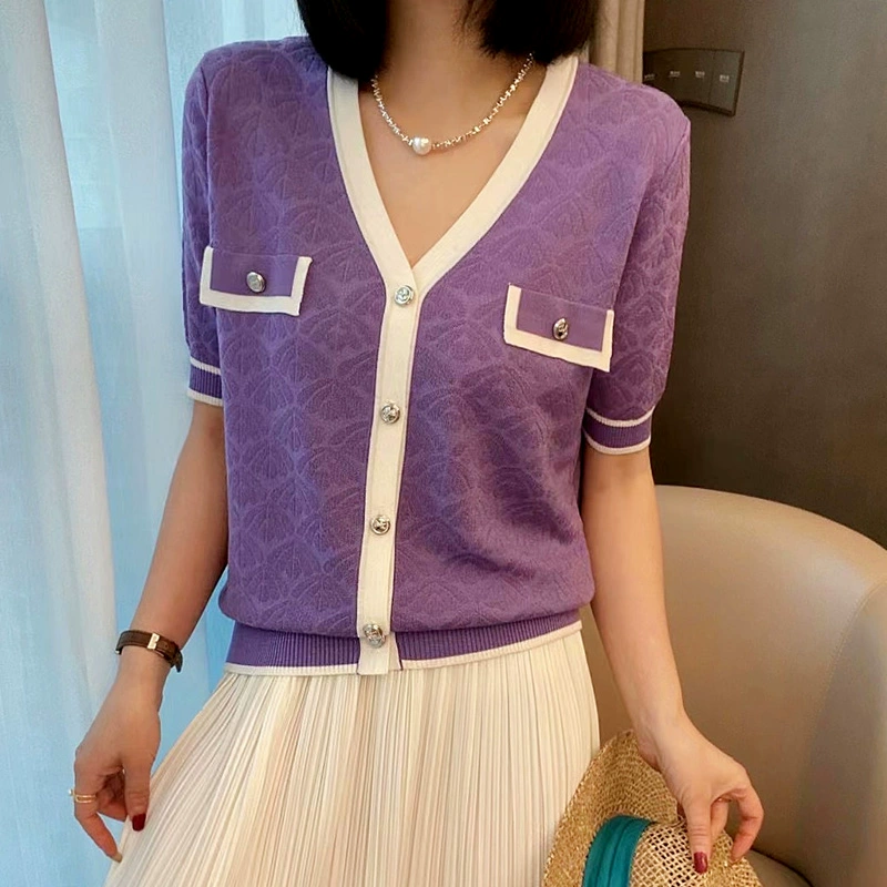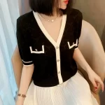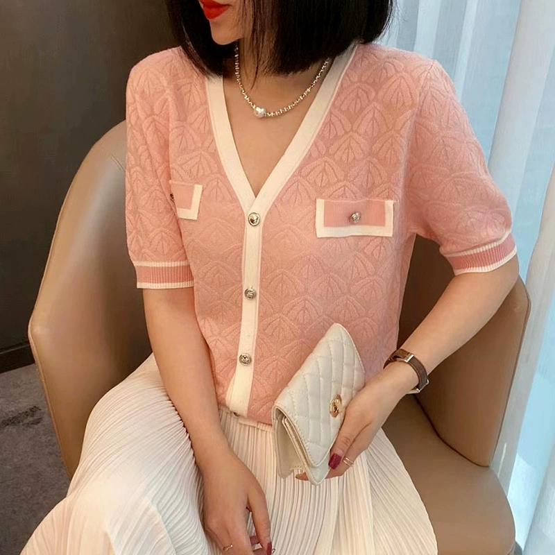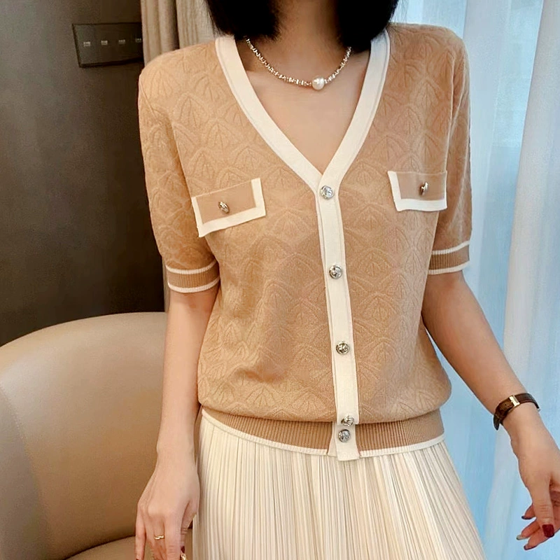 Xiaoxiangfeng pocket cardigan metal button V-neck short sleeves