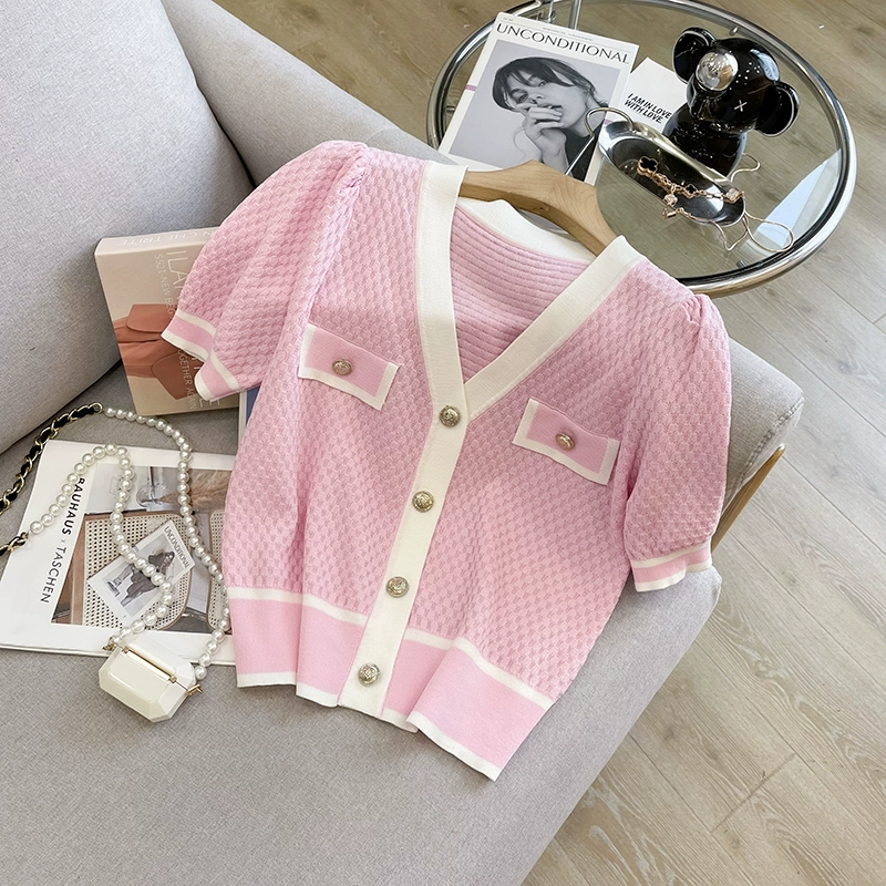 | nameOriginal | Xiaoxiangfeng V-neck pink ice silk short-sleeved sweater |