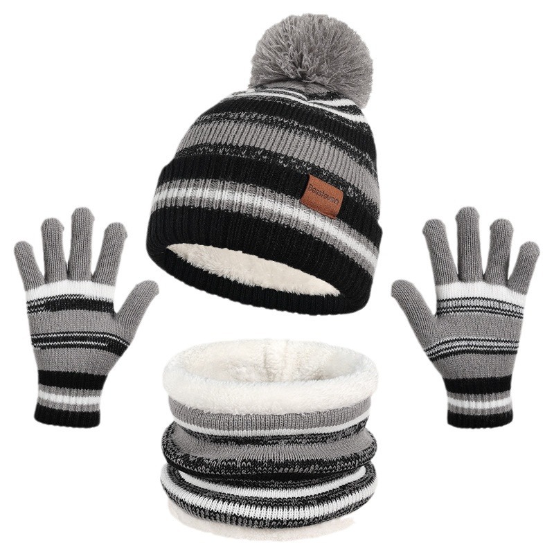 Xietu new children's hat scarf gloves suit autumn and winter knitted fleece-lined warm hat fur ball three-piece set
