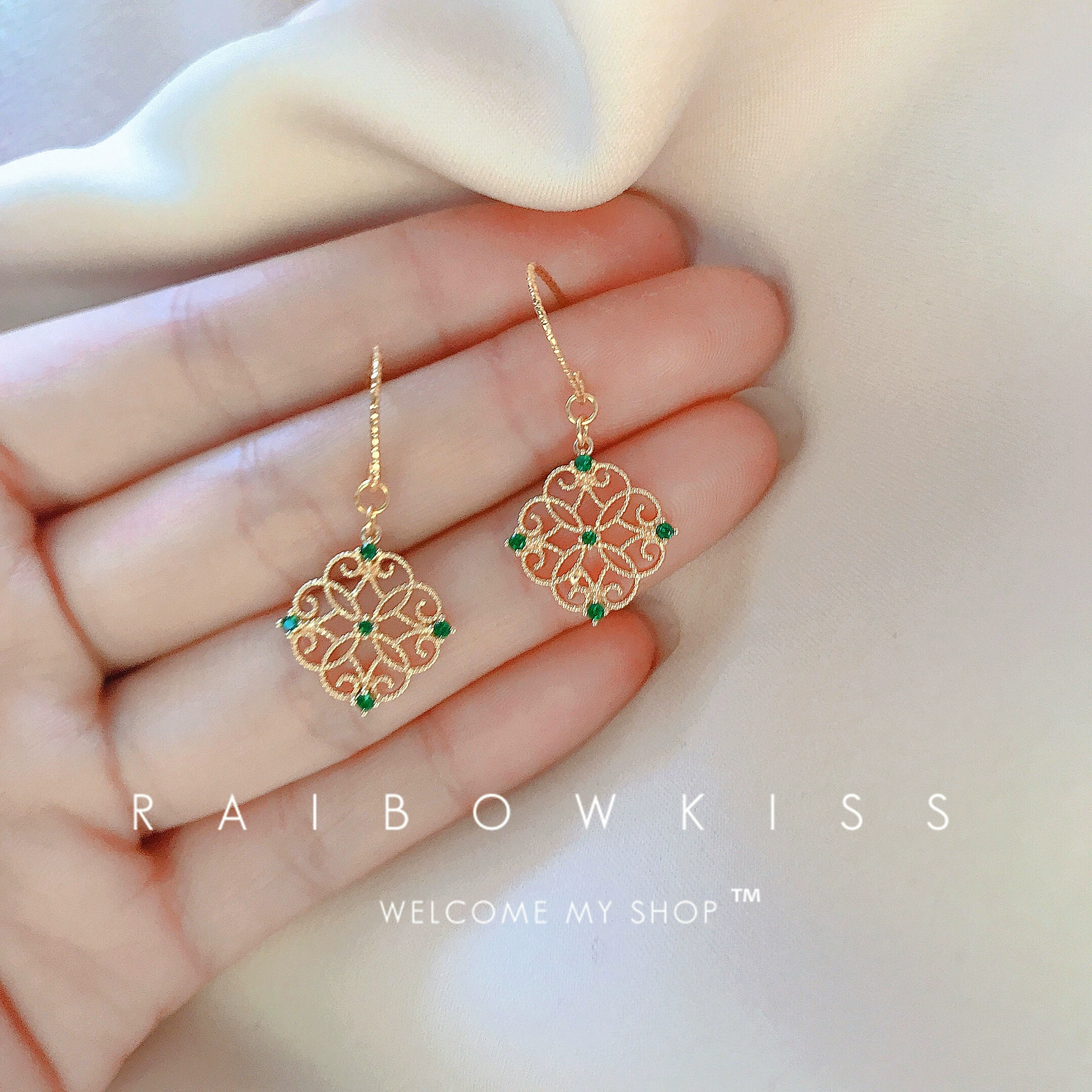 | nameOriginal | Xin Mia elegant 24k gold-filled emerald lucky earrings, retro hollow diamond earrings, earrings and hooks for women |