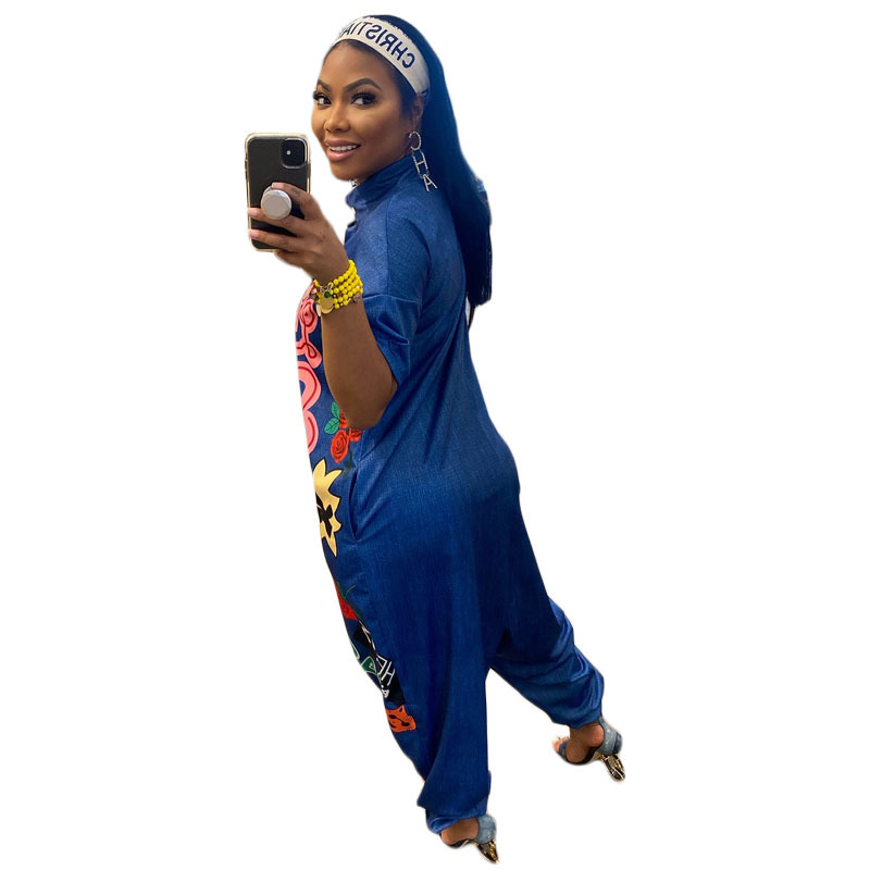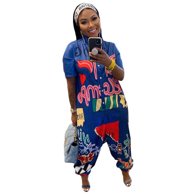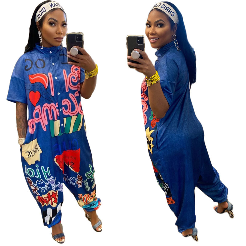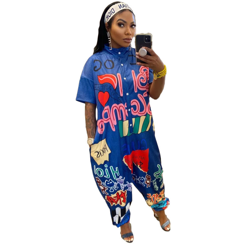Y1143 Foreign Trade Independent Station New Amazon European and American Women's Wide-leg Printed Short-sleeved Casual Sports Jumpsuit